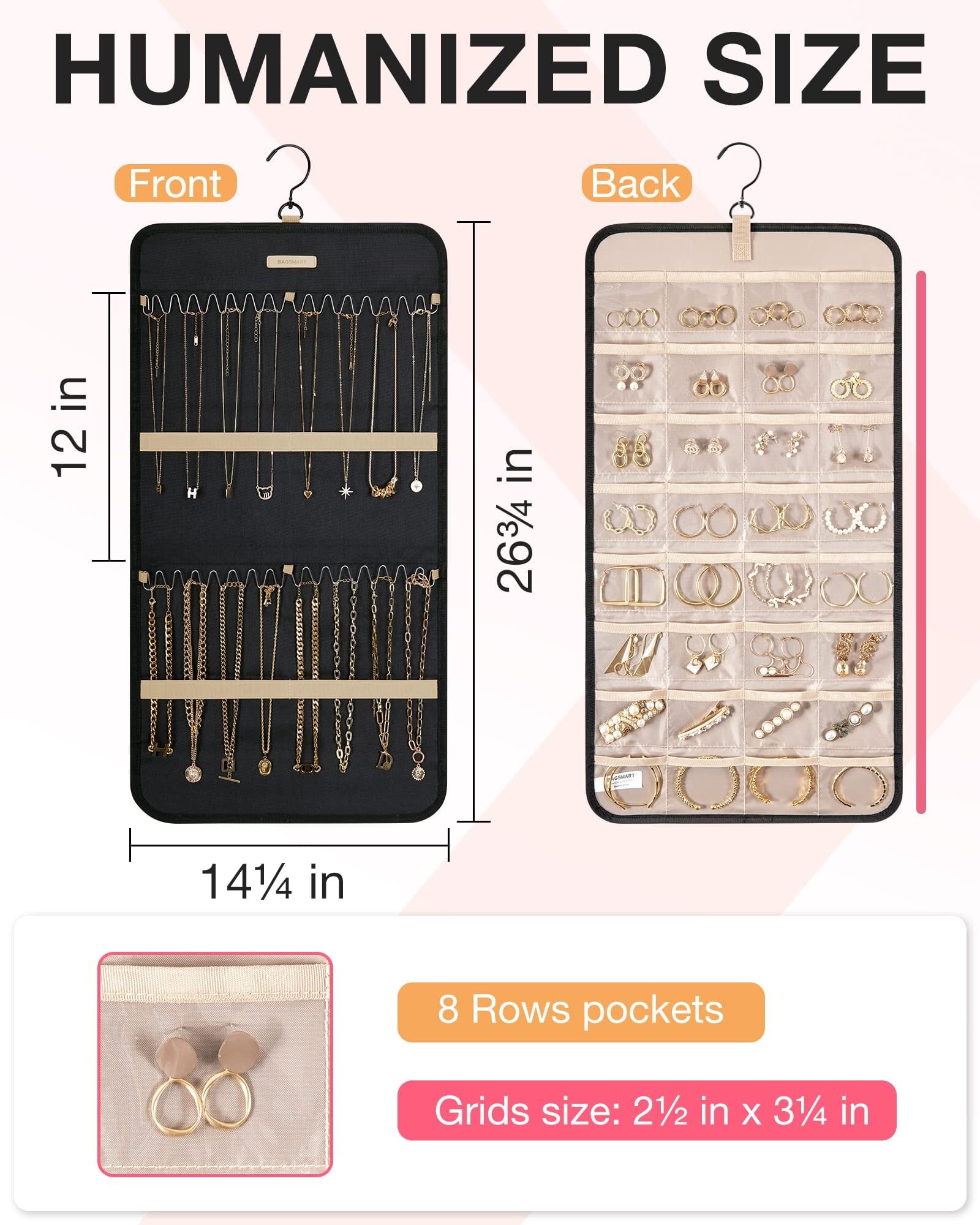 BAGSMART 吊り下げジュエリーオーガナイザー 収納ロール ハンガー付き メタルフック 両面ジュエリーホルダー イヤリング ネックレス クローゼットのリング 壁 ドア Mサイズ ブラック