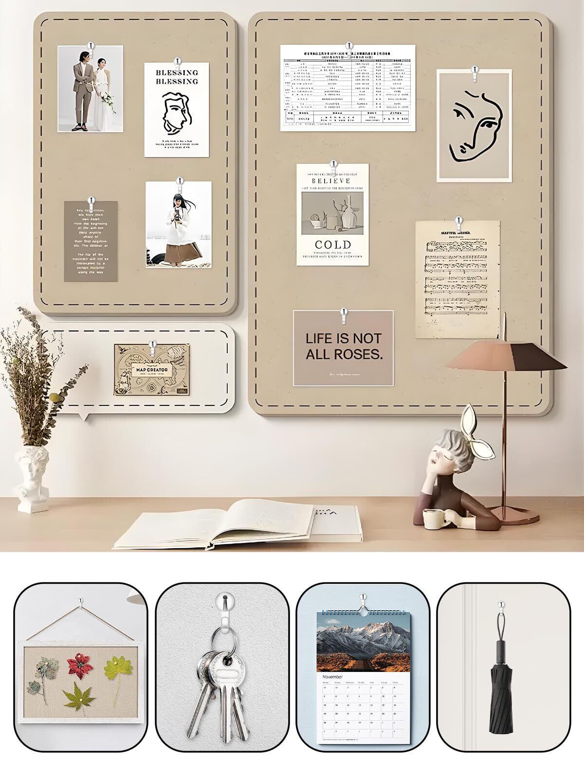【幅広い適用範囲】フックの開口部分が広いため、鍵、カレンダー、時計、絵画、アクセサリーなど幅広いアイテムに対応。石膏ボード、コルクボード、ベニヤ板、木製壁材などに取り付け可能で、日常のあらゆるシーンで活躍します。