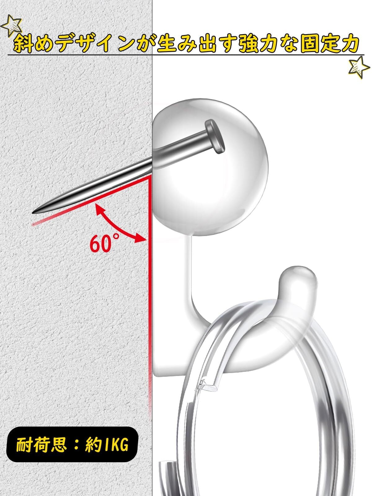 【しっかり固定&安定感抜群】斜めピン設計で安定性をさらにアップ。フックがしっかりと壁に固定され、日用品からやや重めの小物まで安心して掛けられます。耐荷重:約1kg素材:プラスチック+鉄。