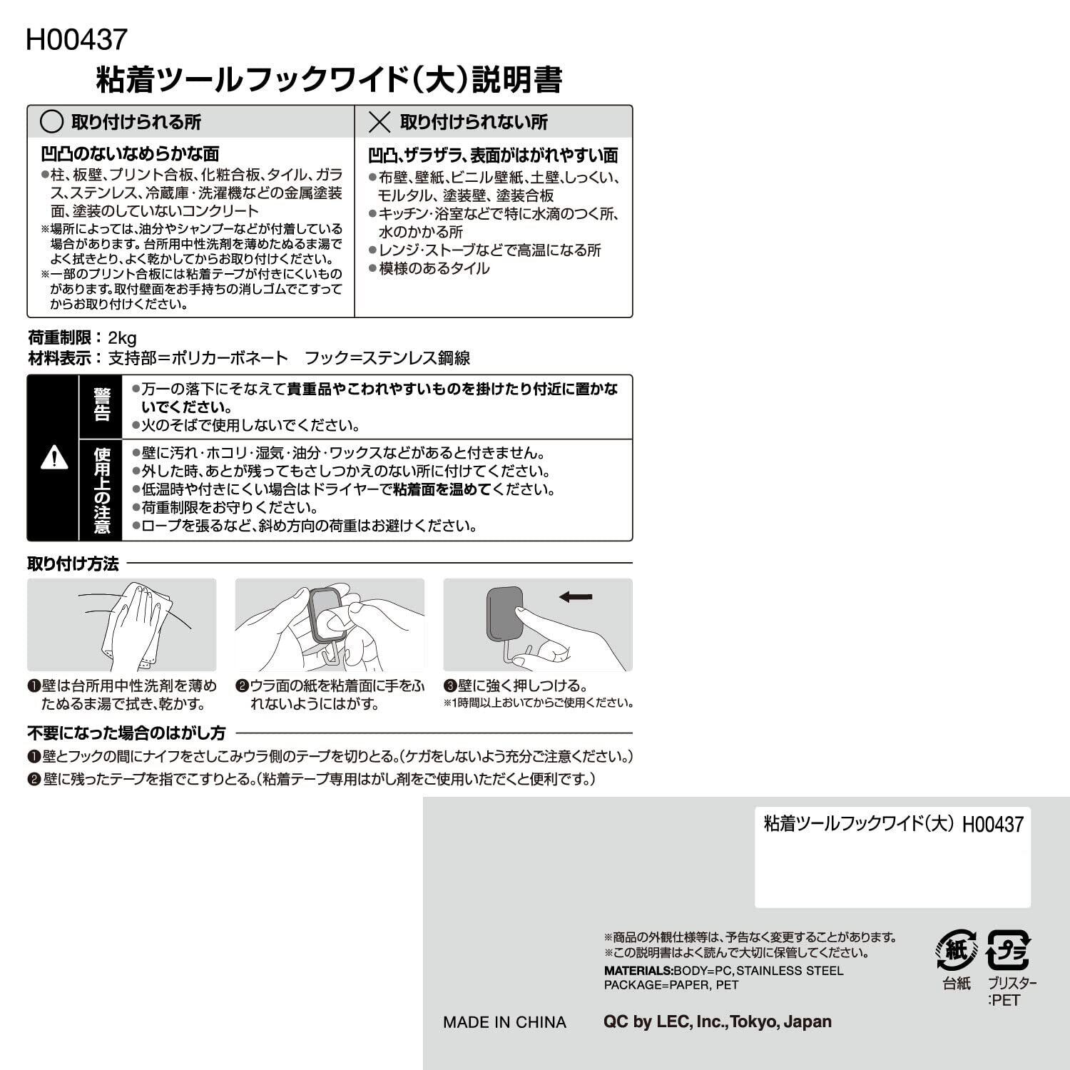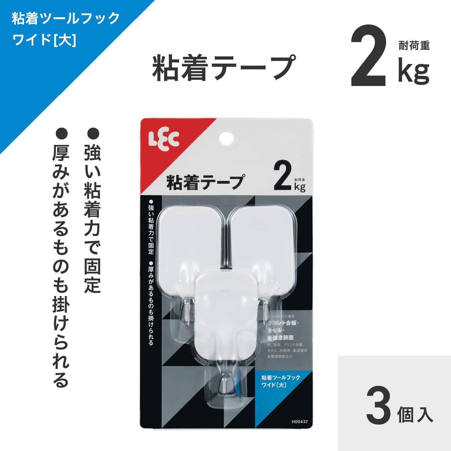 レック(LEC) 粘着ツ-ルフックワイド(大) 3個入 耐荷重:2kg ホワイト H00437
