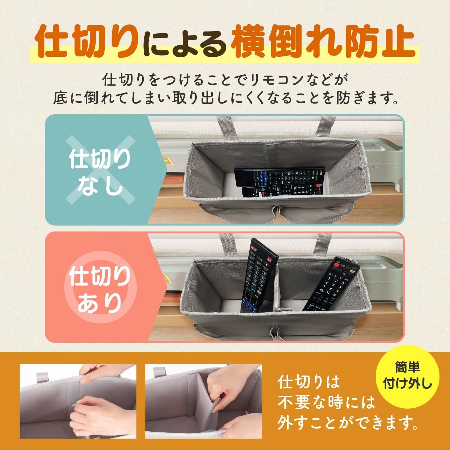 【仕切りによる横倒れ防止】仕切りを設置できるため、リモコンやペン、ハサミなどの細長い物が収納の底で横倒れして取り出しにくくなる心配がありません。 また、仕切りは取り外し可能なので、大きなノートやタブレットなども収納できます。