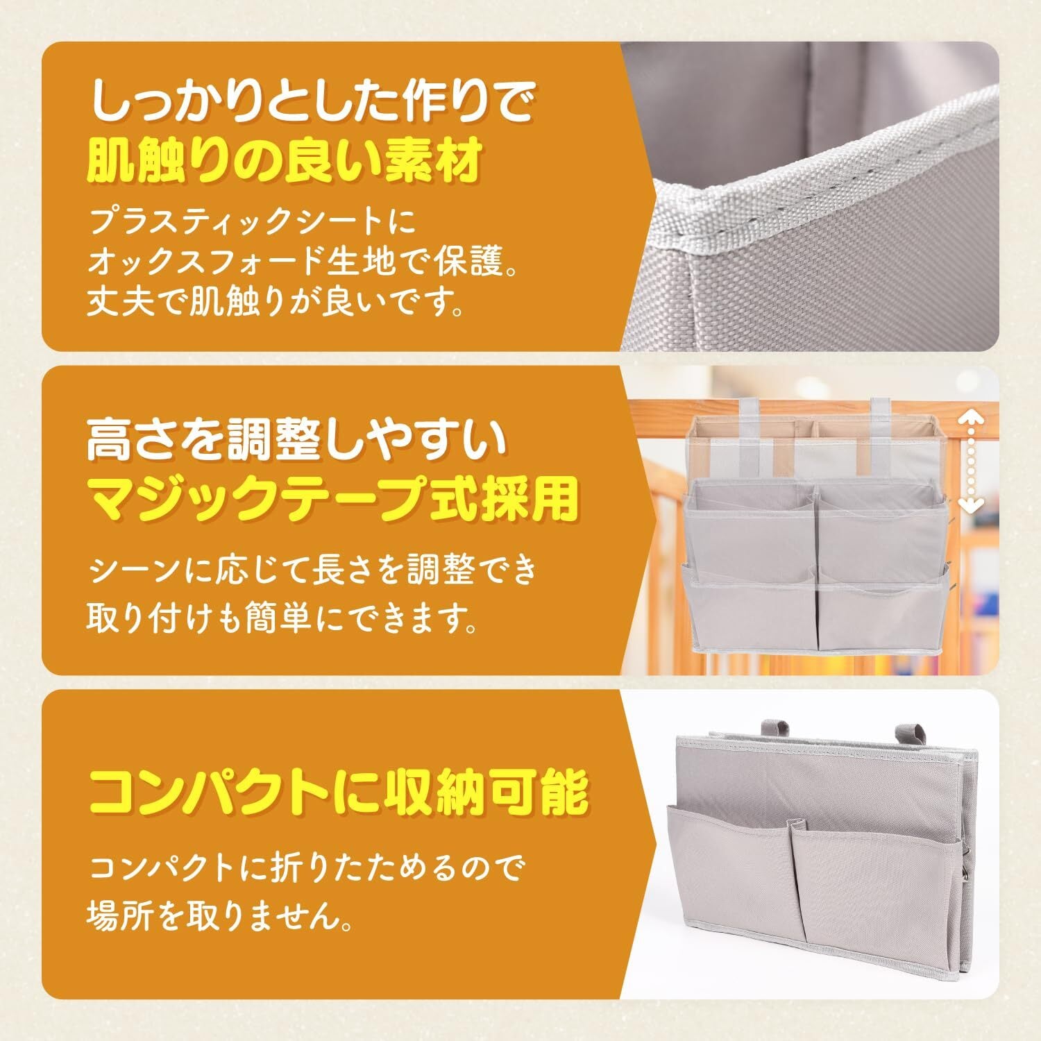 【多用途】VENGOOベッドサイド収納は、ベッドガードや椅子の肘掛けなど、生活空間の手が届く範囲に設置できるため、便利で使いやすい収納です。さらに、車のヘッドレストやベビーカーにも自然に取り付けられ、外出時にも便利です。