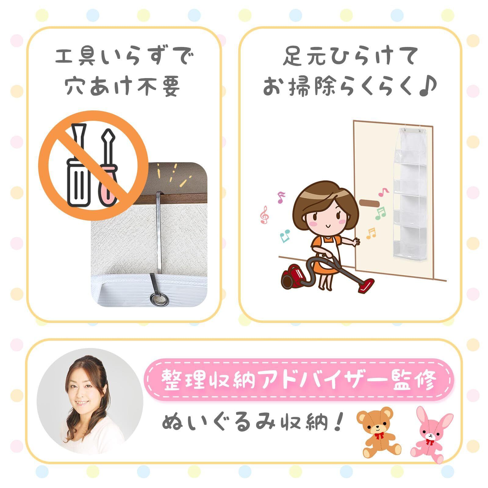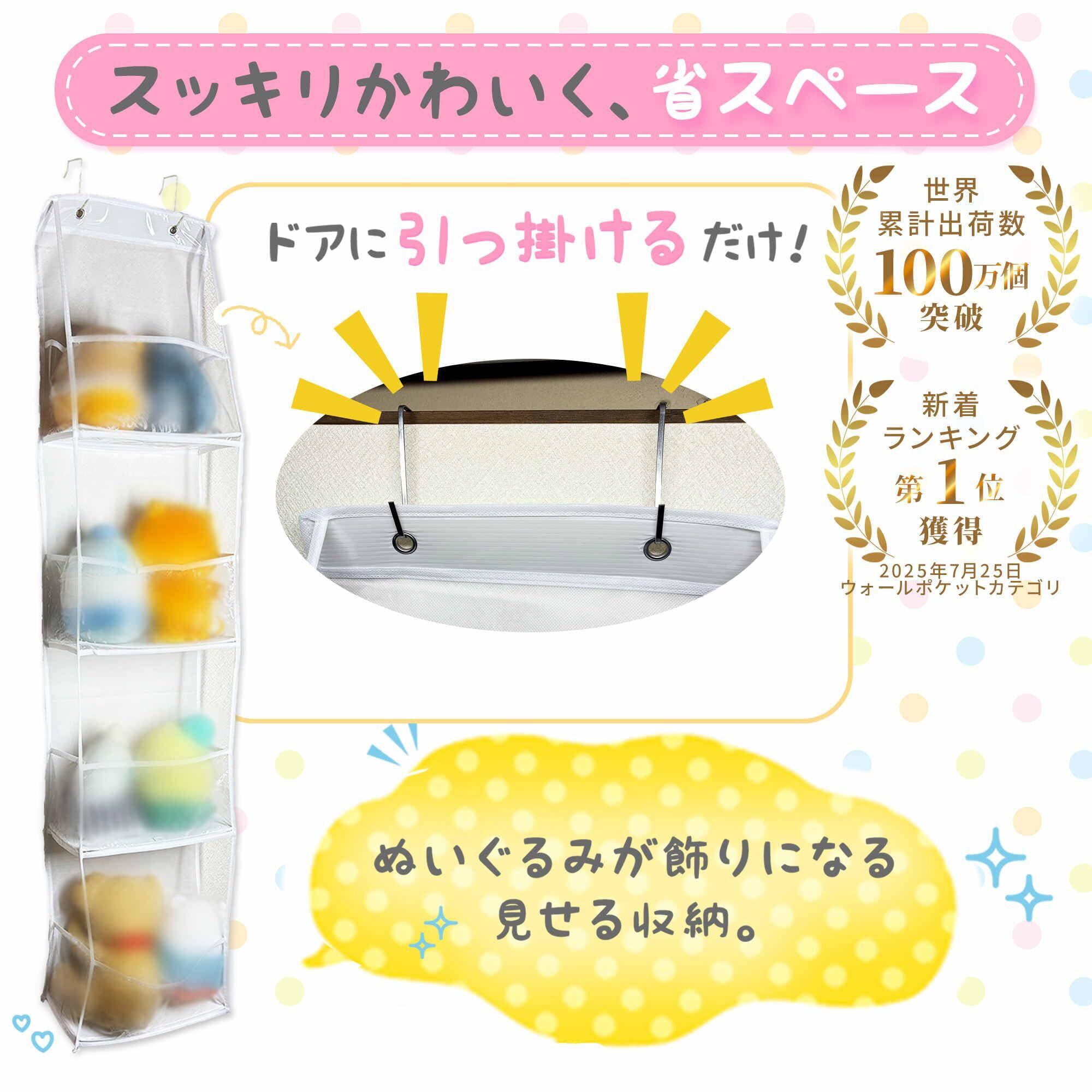 【省スペースでスッキリ片付く】 床を使わず、ドアや壁に掛けるだけのぬいぐるみ収納。お部屋の空間を広く使えるから、見た目も気持ちもスッキリ。収納スペースに悩む方にぴったりです。