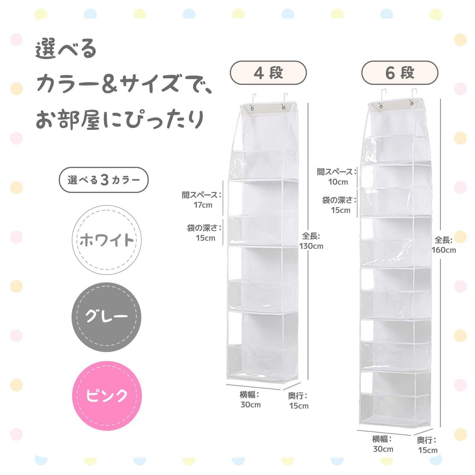 【選べるサイズとカラー】 4段/6段から選べて、カラーはホワイト・グレー・ピンクの3色展開。お部屋の雰囲気やぬいぐるみの量に合わせて、ぴったりの組み合わせが見つかります。