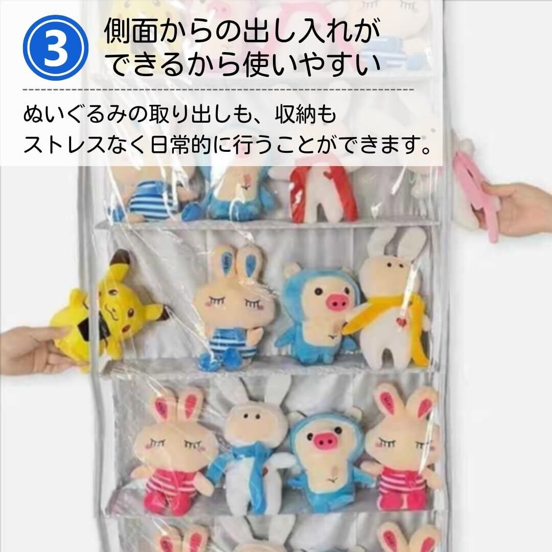 【便利な側面出し入れ】側面からの出し入れができるため、使い勝手が抜群です。ぬいぐるみを取り出す際も、収納する際もスムーズに行え、日常の使い勝手を大幅に向上させます。