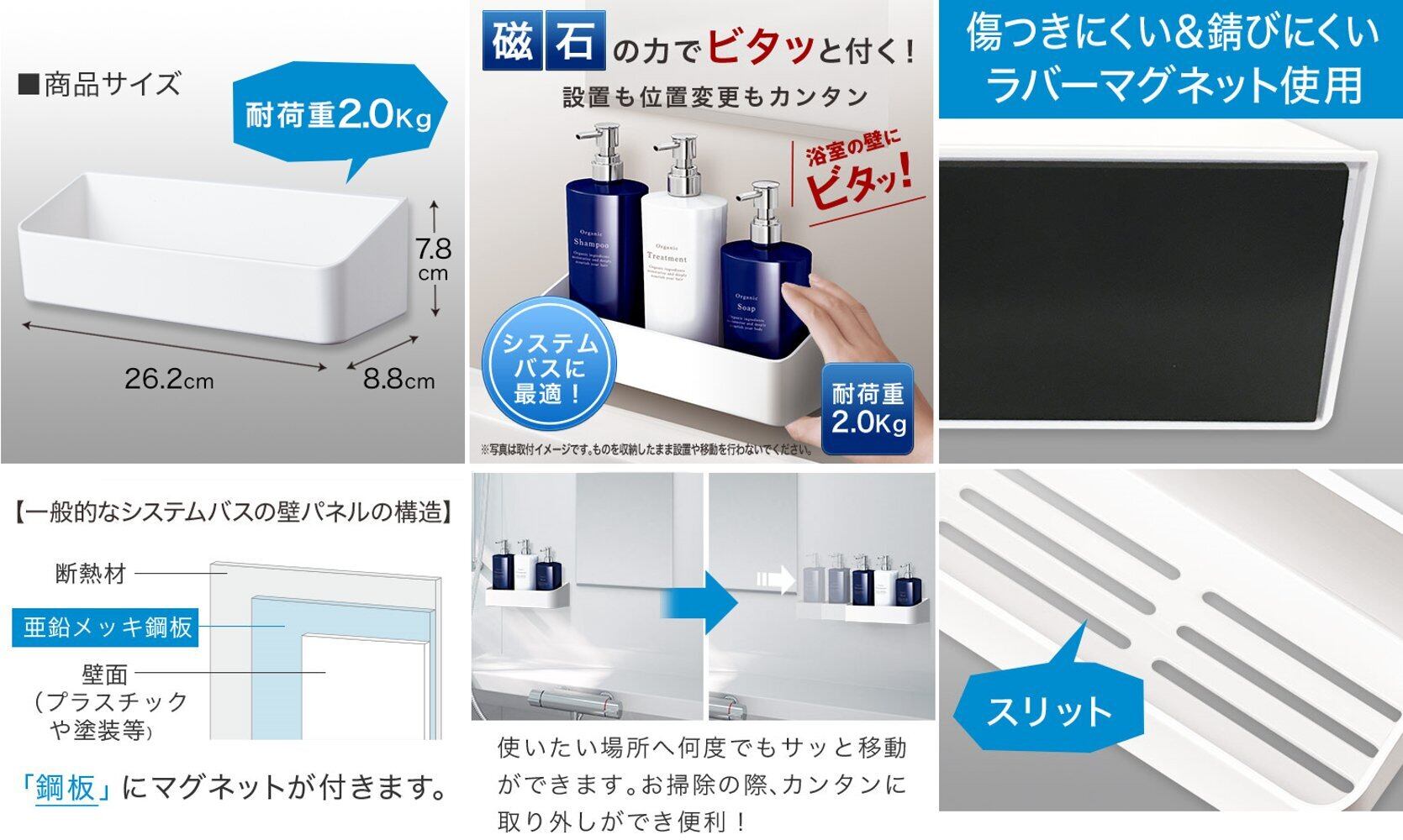 ●ラックス マグネット式浴室収納シリーズ取付けが簡単で、用途にあわせて自在に位置変更できるマグネットタイプです。「鋼板」に付きます。※特殊な処理を施した壁面では耐荷重性能が下がったり、付かない場合があります。材質:ABS樹脂耐荷重:2kg