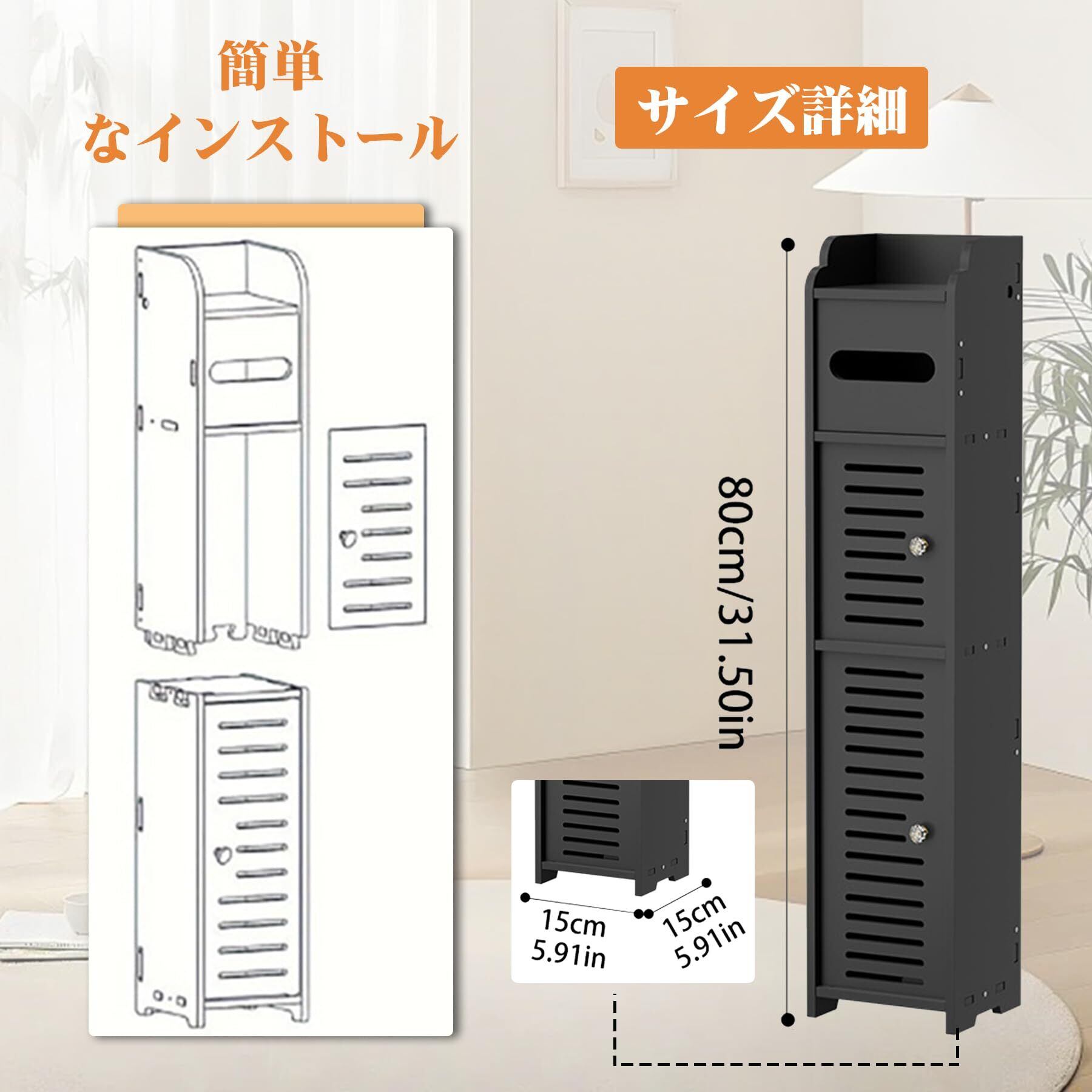 CZEAR トイレ 収納 隙間収納 スリム 収納 防水 防湿 組立簡単 玄関/洗面所/寝室/書斎 省スペース バスルーム収納棚 (ブラック, 15*15*80cm(2つのドア))