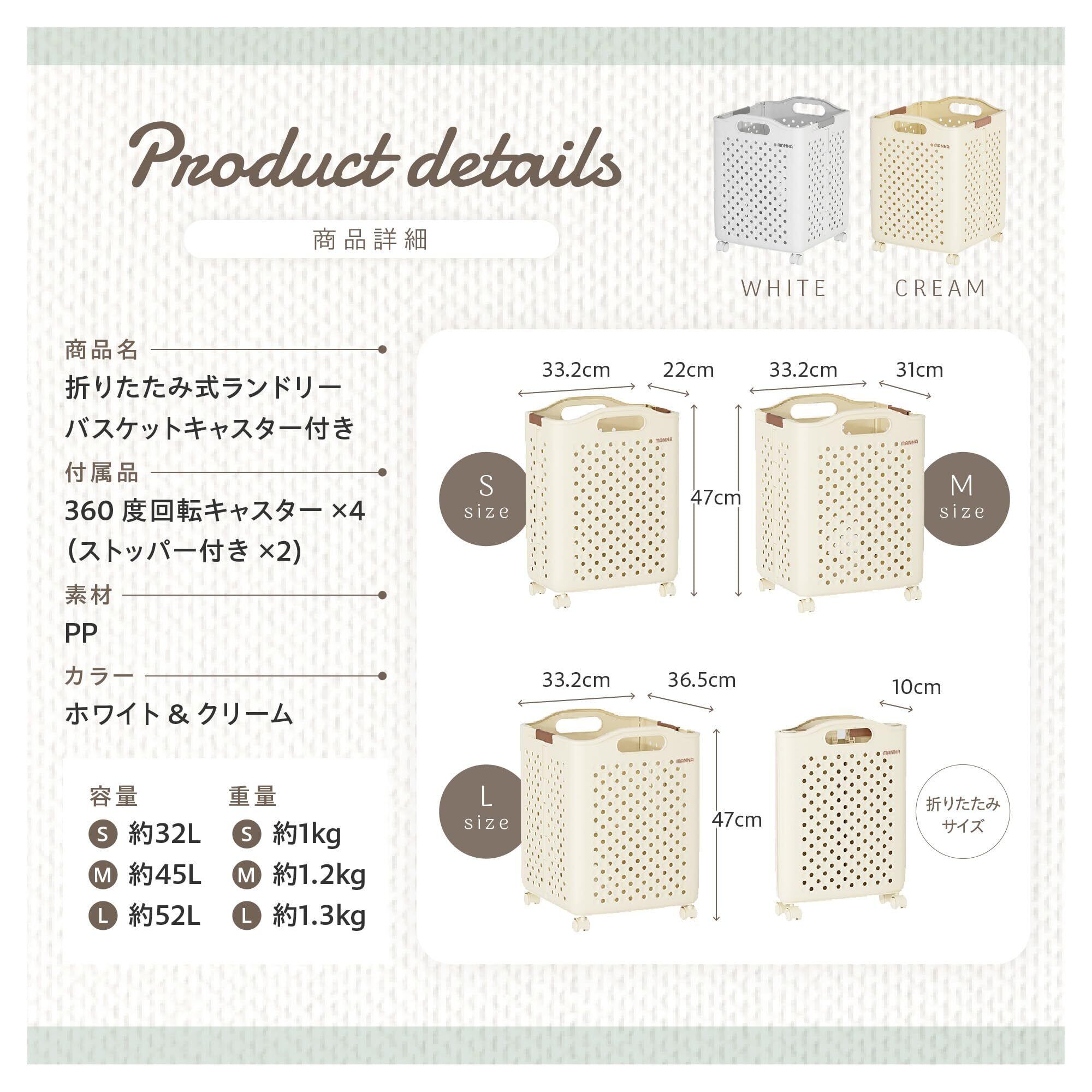【折り畳み式&組み立て簡単】収納時はわずか10cmの薄さで折りたため、スペースを広々と活用できます。洗面所やランドリールームにぴったりの収納デザインで、必要な時には大容量のバスケットとして活躍します。 S(32L)、M(45L)、L(52L)の3サイズ展開で、どんな家庭や生活スタイルにもフィット。コンパクトさ(小型)と大容量を両立した便利なアイテムは、日常の洗濯をもっと快適にサポートします。