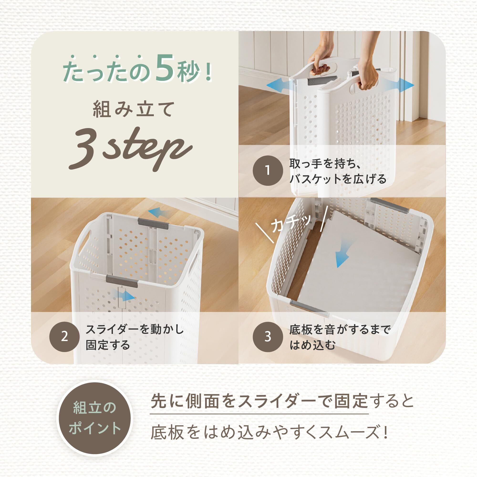 【頑丈構造】全体は、良質で厚めのPP素材を採用。滑らかでバリがなく、より安心して使えます。高耐荷重。変形しにくく、より丈夫。畳める折り畳み式で組み立て簡単な洗濯カゴ!たった5秒で完成する、便利なランドリーバスケットです。 取手を持ちバスケットを広げ、スライダーを動かし固定、底板をカチッと音がするまではめ込む、たった3ステップで完成! また、多数の空気穴で湿気を逃がし、清潔さをキープ。防水と撥水加工に優れたPP素材だから水にも強く、丸洗いもOK!