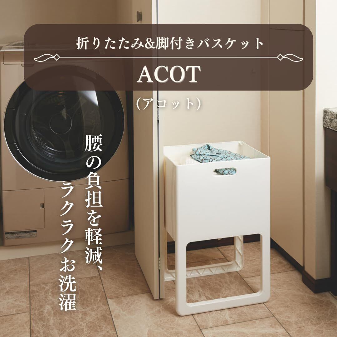 伊勢藤(ISETO) ランドリーバスケット 折りたたみ&脚付きバスケット ACOT ホワイト 幅40×奥行4.0~30.0×高さ61.0cm 日本製 折りたたみ 脚付き 腰の負担軽減 収納 洗濯 服 I-541