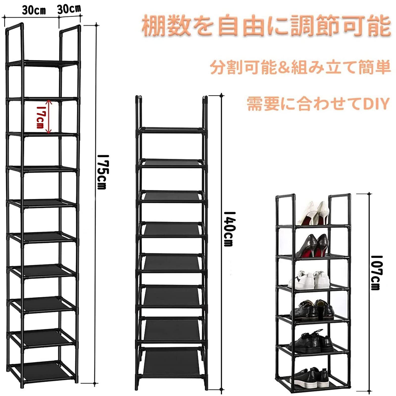 YOUDENOVA シューズラック10段 靴収納 分割可 シューズラックスリム 省スペース 組み立て式 10足 不織布 玄関に靴を効率収納 (ブラック、10段)