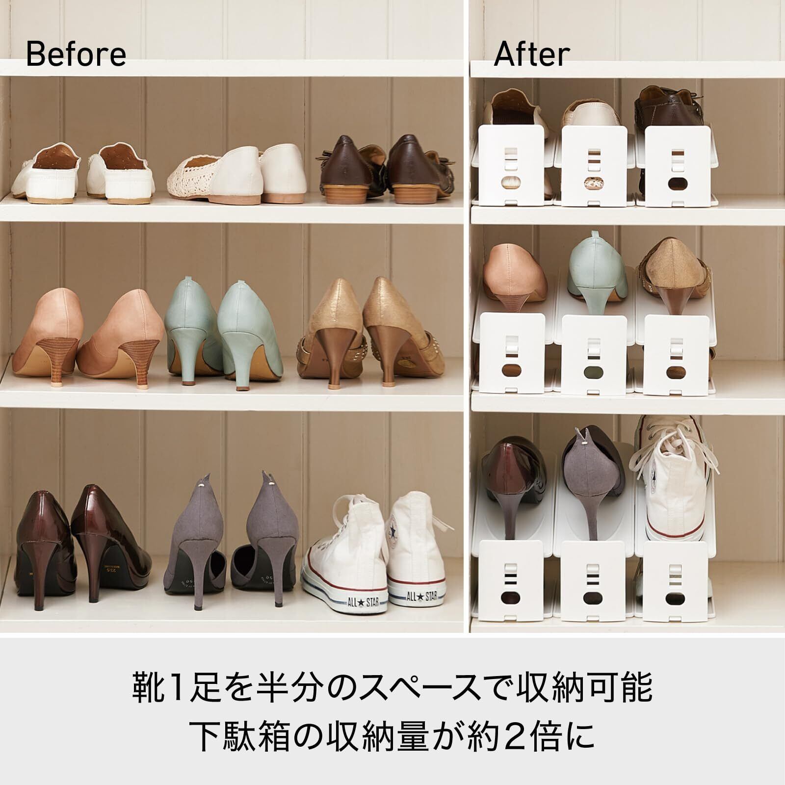様々な靴を半分のスペースに収納できるので2倍の収納量を実現します。