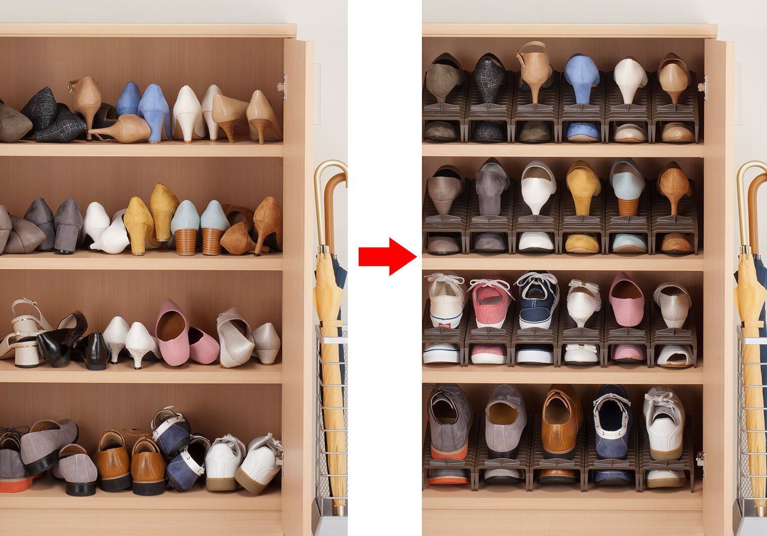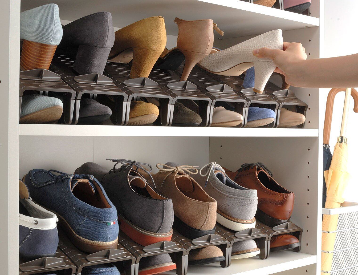 およそ2分の1のスペースで収納できるから、下駄箱がスッキリ
