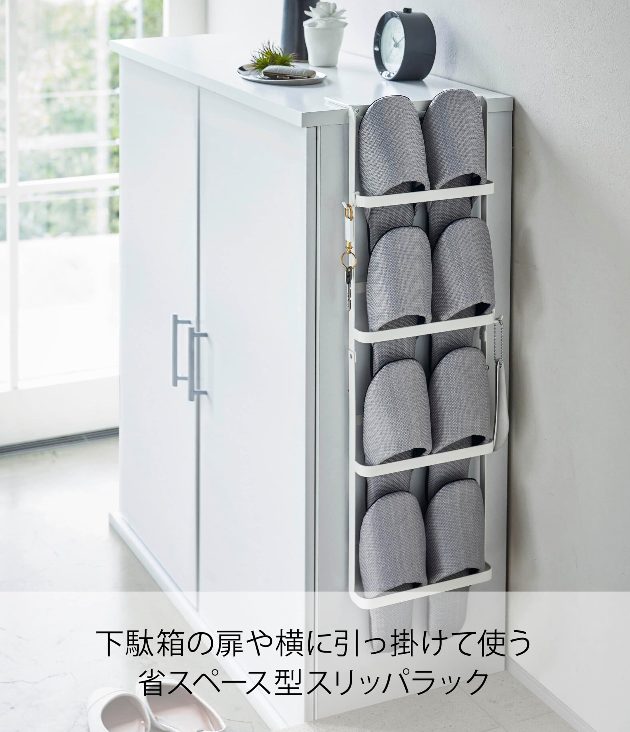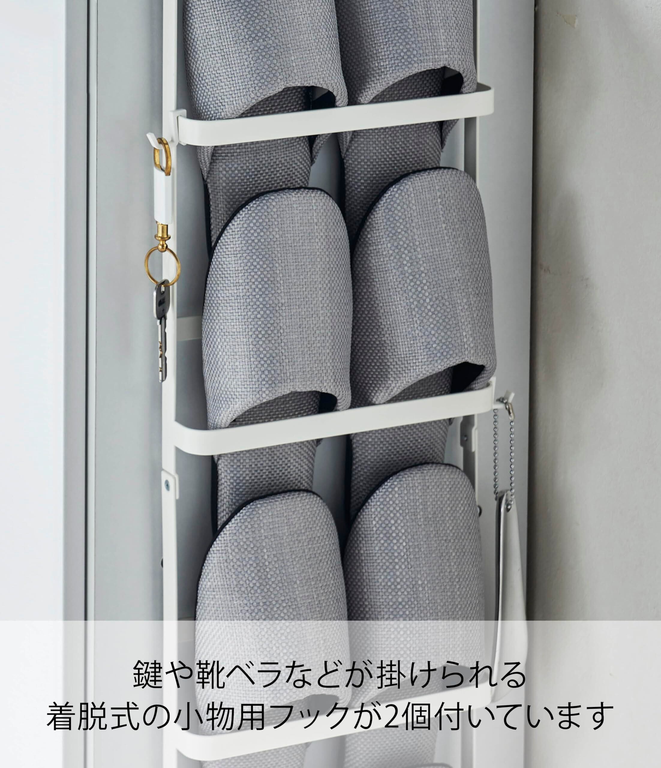 下駄箱の横や扉に引っ掛けて使う省スペース型スリッパラック。