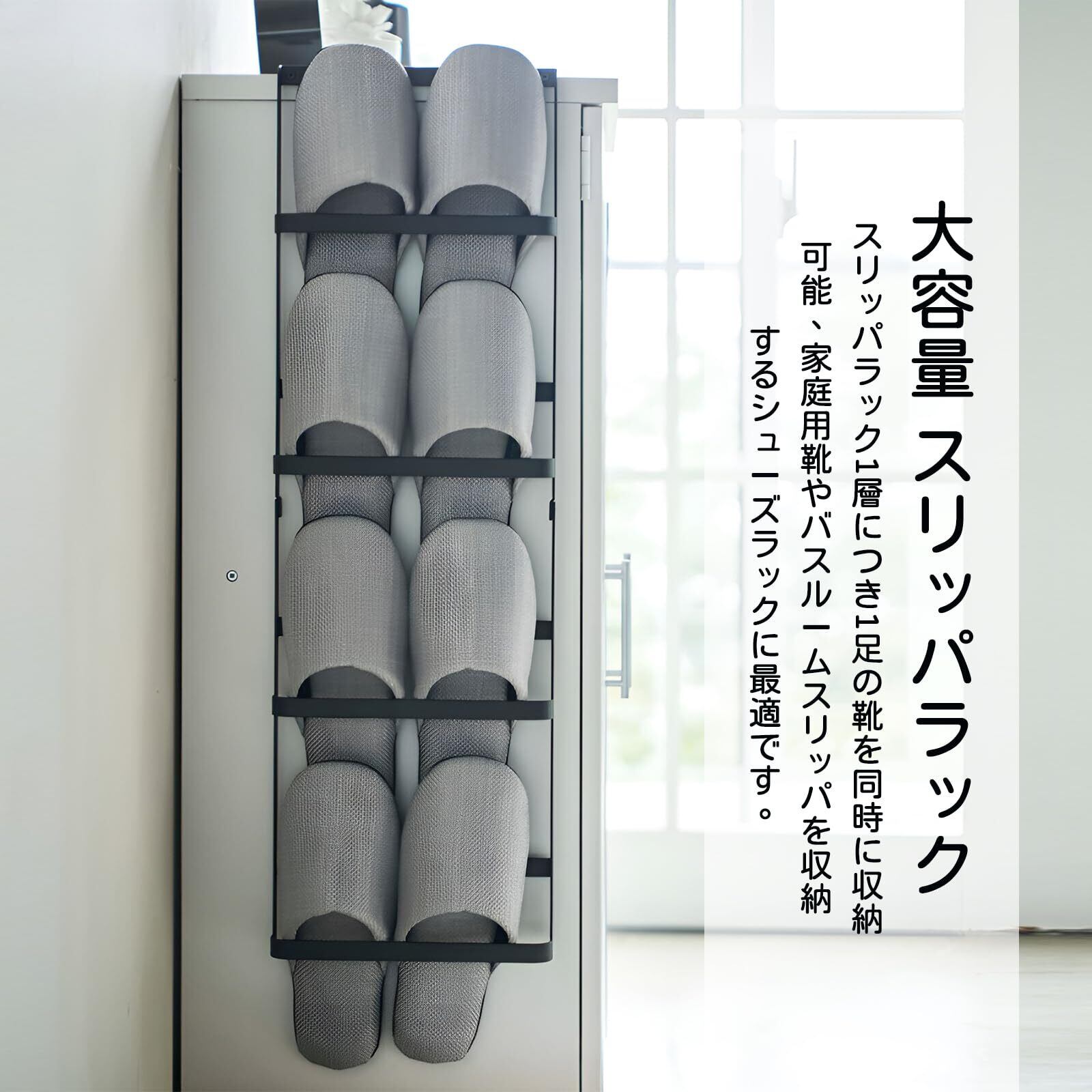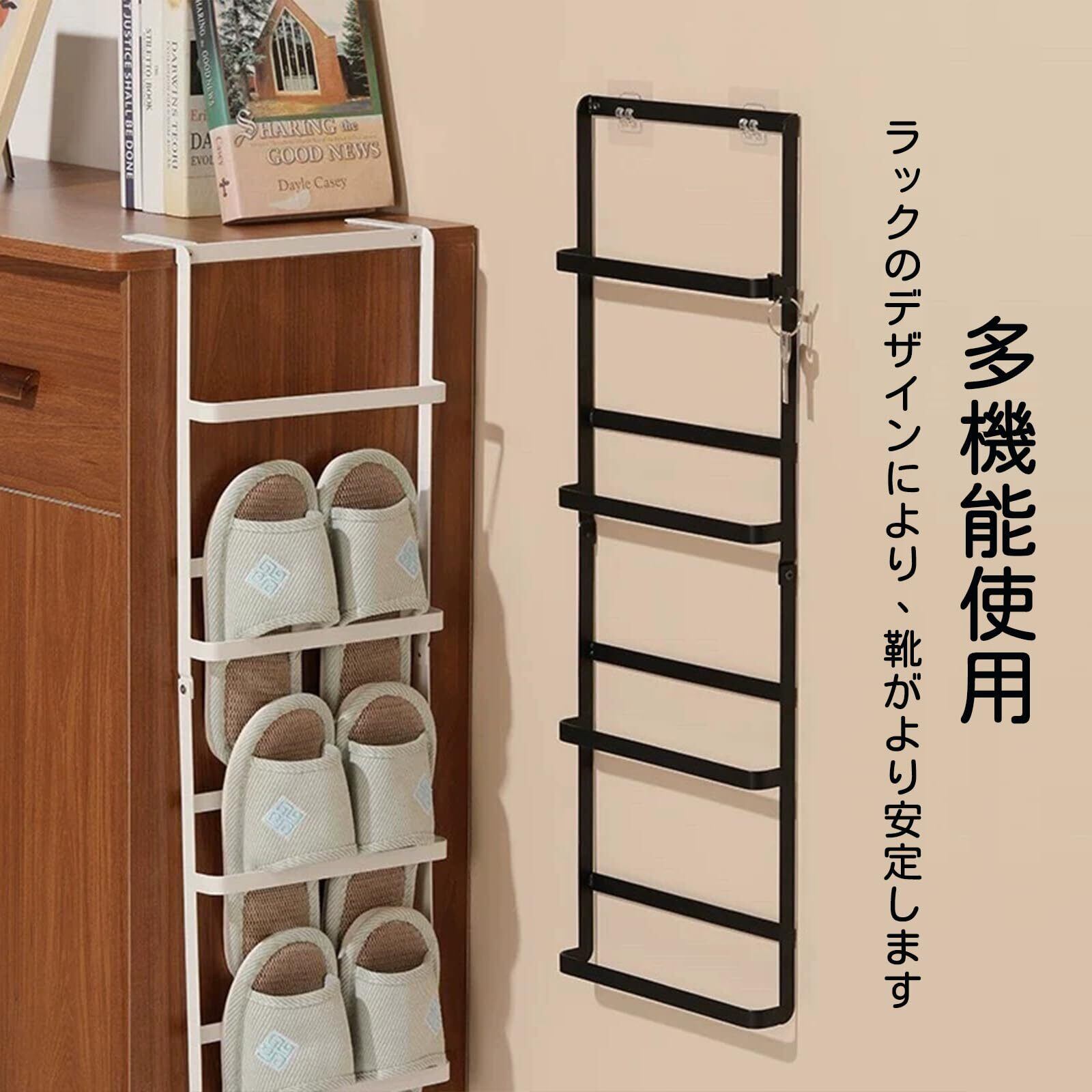 【使用範囲が広い】スリッパラックはトイレ、ベッドルーム、ホテルや浴室などに適用します。使用範囲が広い。上から差し込むように入れるだけの簡単設計。組立は不要です、完全品の状態に届きました。壁やドアの後ろに設置でき、床にある既存のすべての棚、キャビネット、靴の収納スペースを作成して、スペースを節約し、手元に置いておくことができます。
