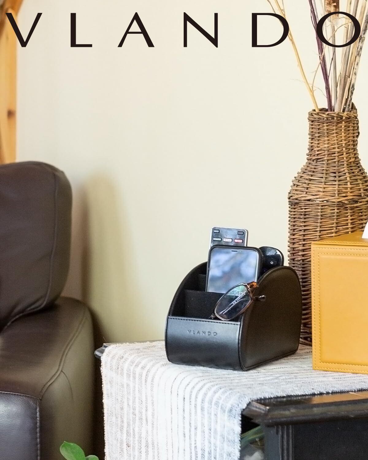 Vlandoリモコンラック PUレザー 大きいサイズ リモコン収納 テーブル 5格仕切り リモコンスタンド おしゃれ 防水 多機能収納ボックス 大容量 文房具 卓上小物 ブラック