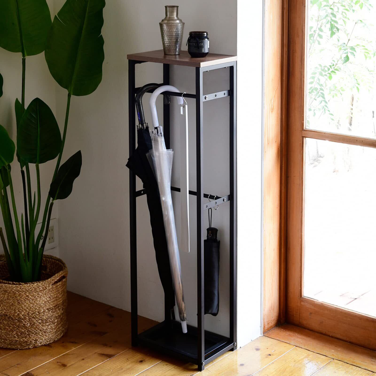 ※2023年4月より仕様変更し、傘がかけやすくなりました。【スリムでスマートな傘掛け】木製の天板とスチールの本体でできた傘掛け。奥行20cmなので、スリムにスマートに傘を収納できます。脚にはアジャスターが付いているので、お使いになる床面に合わせて調節ができ、ガタ付きをおさえることができます。天板は芳香剤や鍵などが置けて便利です。