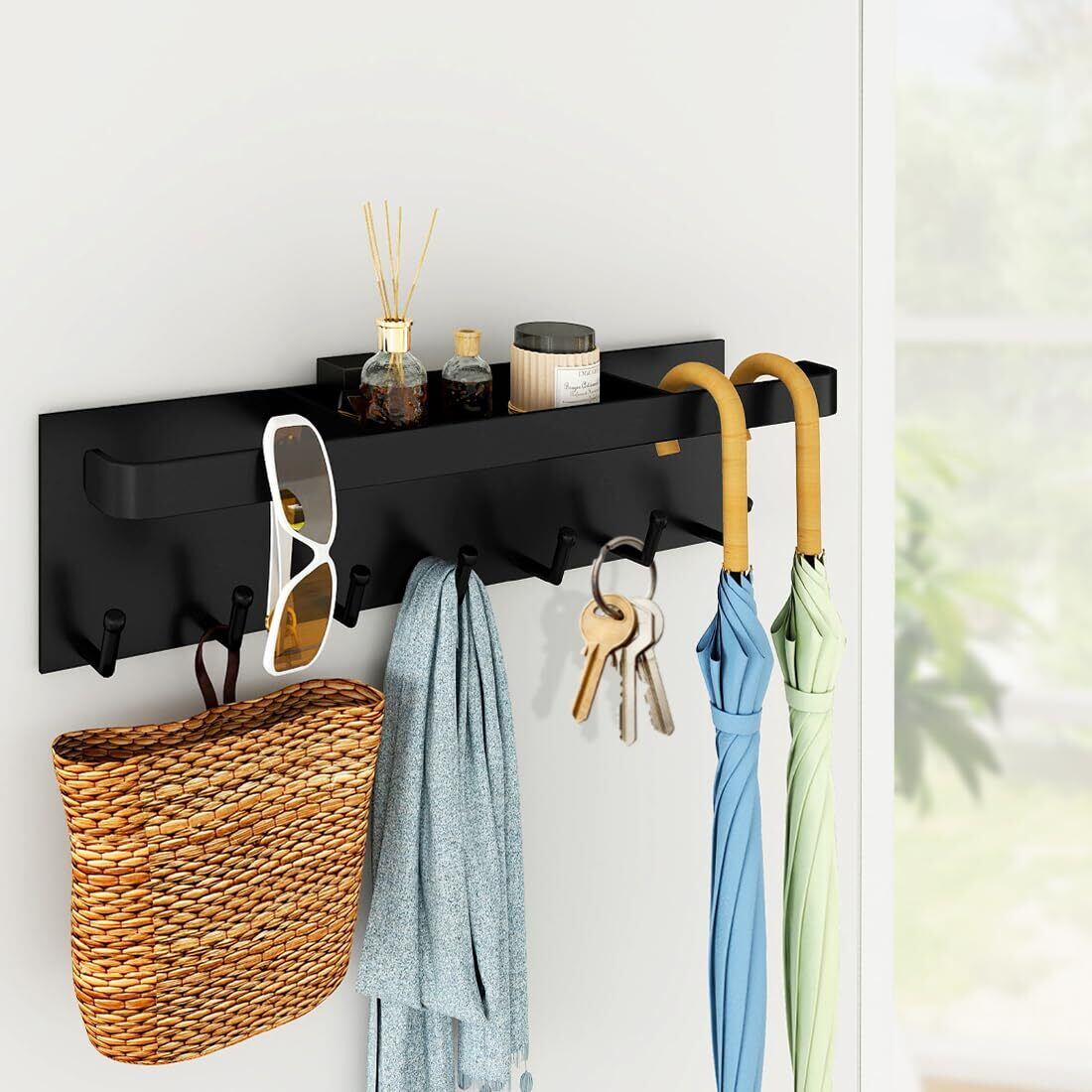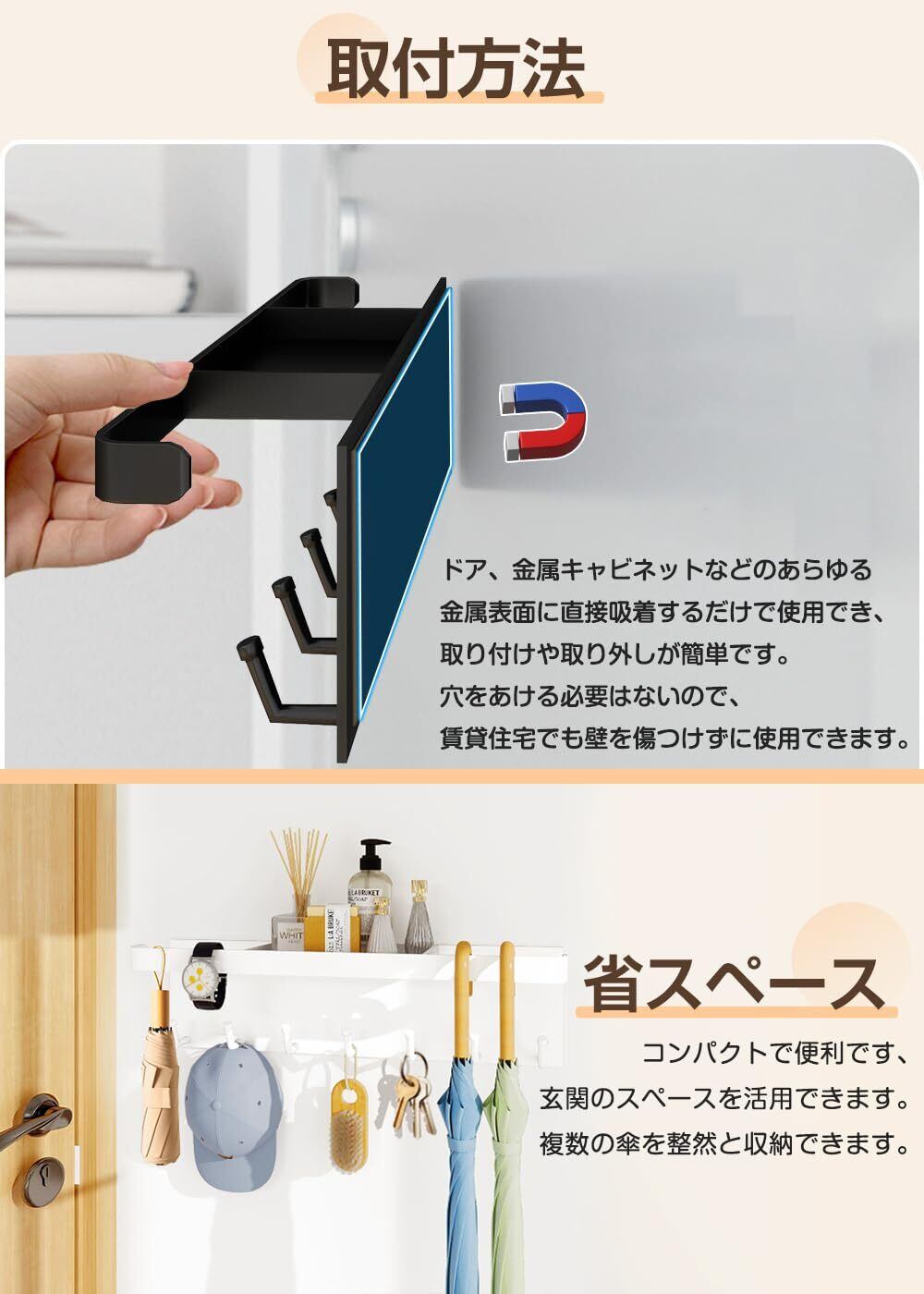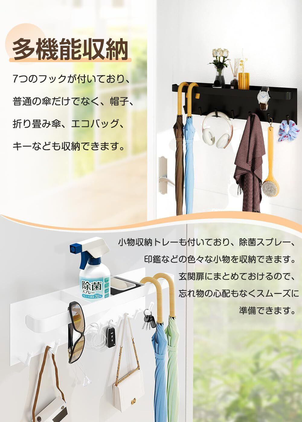 【多機能収納】マグネットアンブレラホルダーは7つのフックが付いており、普通の傘だけでなく、折り畳み傘、エコバッグ、帽子、キーなども収納できます。小物収納トレーも付いており、サングラスや除菌スプレ一、印鑑などよく使う小物をまとめて置け、玄関がスッキリになります。玄関扉にまとめておけるので、忘れ物の心配もなくスムーズに準備できます。使い勝手を考えたデザインが、お客様の快適な生活をサポートします。