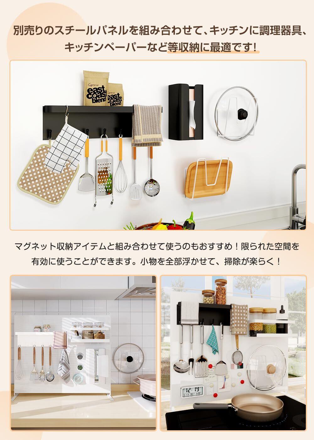 【多用途】玄関だけではなく、キッチン、浴室洗面台なども活躍します!別売りのスチールパネルを組み合わせて、キッチンに調理器具、キッチンペーパーなど等収納に最適です!マグネット収納アイテムと組み合わせて使うのもおすすめ!限られた空間を有効に使うことができます。小物を全部浮かせて、掃除が楽らく!