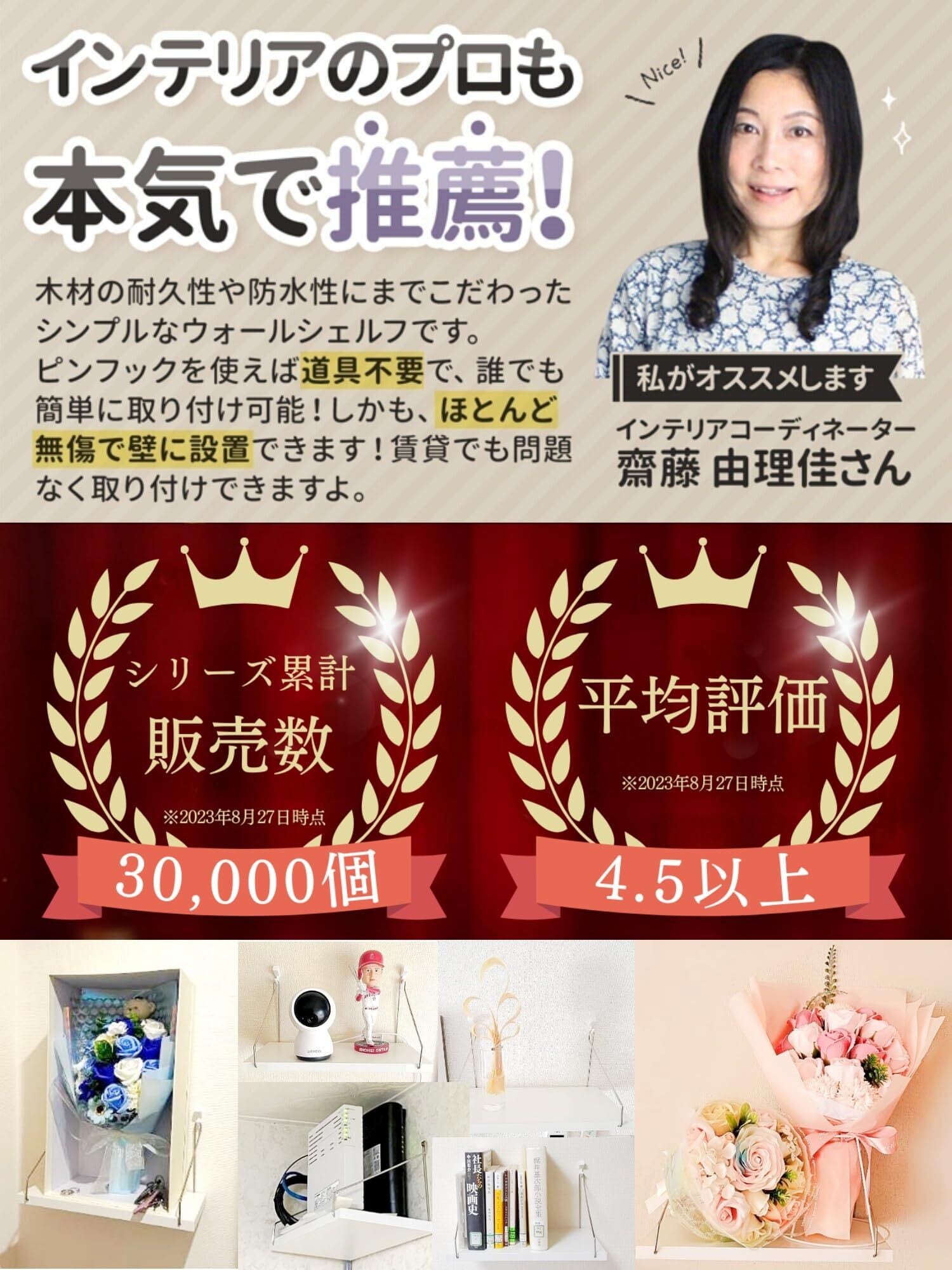 【インテリアのプロも大絶賛】《インテリアコーディネーター齋藤理佳さんのコメントより抜粋》木材の耐久性や防水性にまでこだわったシンプルなウォールシェルフです。ピンフックを使えば道具不要で、誰でも簡単に取り付け可能!しかも、ほとんど壁を傷つけません! 賃貸でも問題なく取り付けできますよ。着脱式の落下防止ガードも付属しているから、落下も徹底防止します!