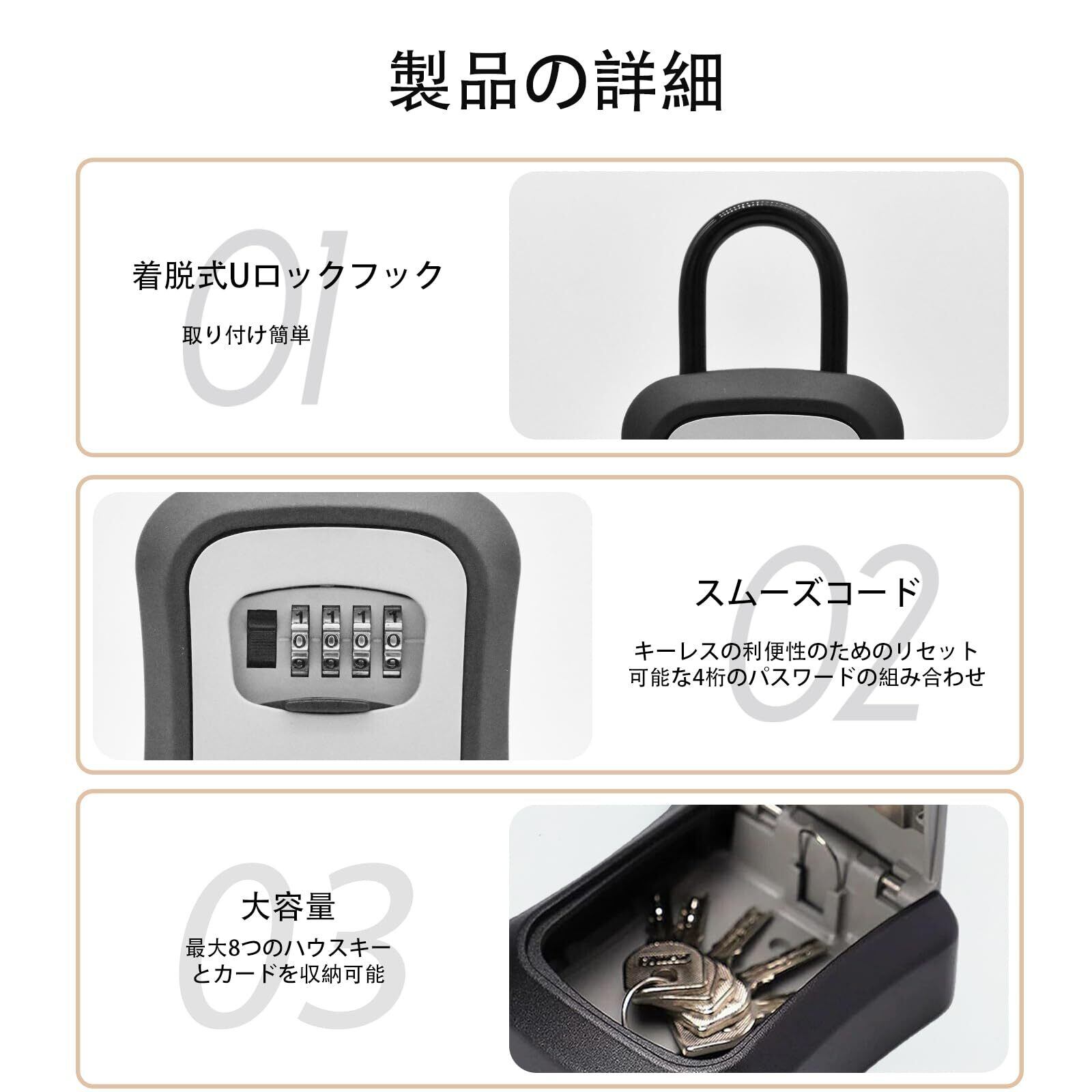 整理と収納の便利さ:8.6cm x 6.5cm x 3.5cmの大容量設計で、これにより、複数の鍵を整理して保管でき、必要な時にすぐに取り出すことができます。大きな収納スペースは、さまざまな種類の鍵や小さなアイテムを安全に保管するのに理想的です。