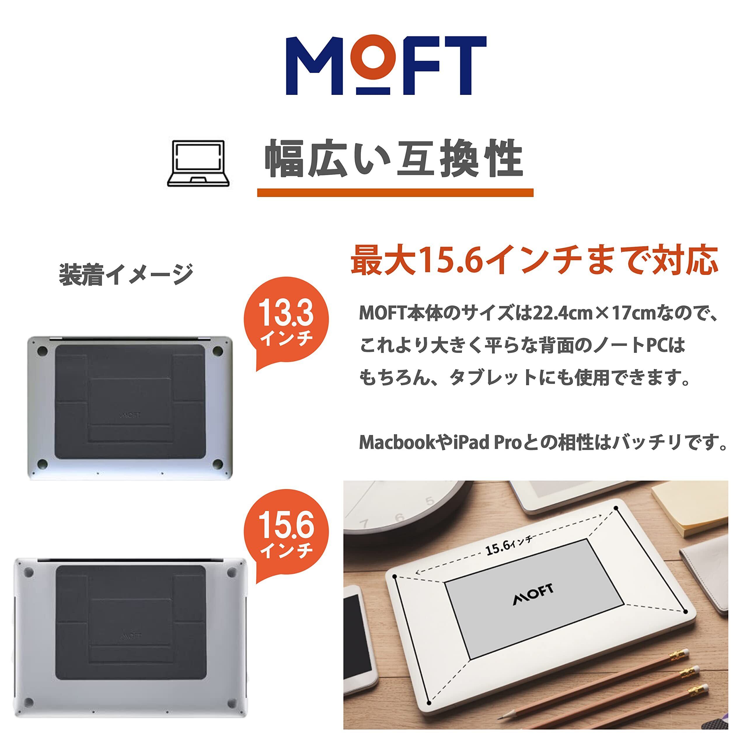 【驚きの薄さ、忘れる存在】 重さ僅か89g、厚さも3mmとなっています。マグネット内蔵設計で、スタンドを収納する時はパソコンの下に隠れることができ、存在感が極めて薄くなります。一方で、立てるときは速くてスマートになり、一度使うと忘れ難いパソコンスタンドです。最大15.6インチまでに対応、底穴付きの放熱対策も採用しています。Macbook Pro/Air/タブレットはもちろん、他の平底ノートPCにも対応するので、MOFTスタンドを是非一度試してください!