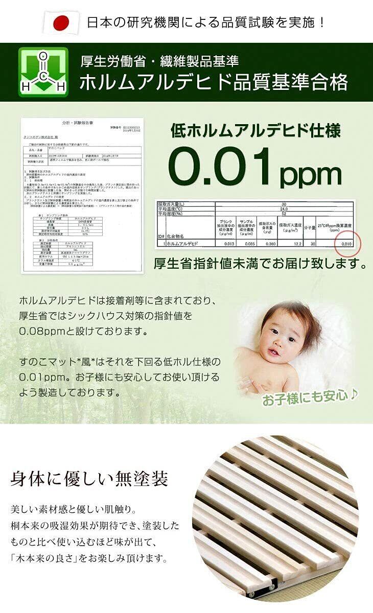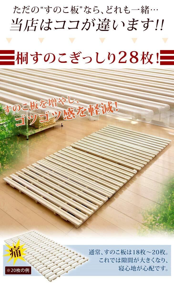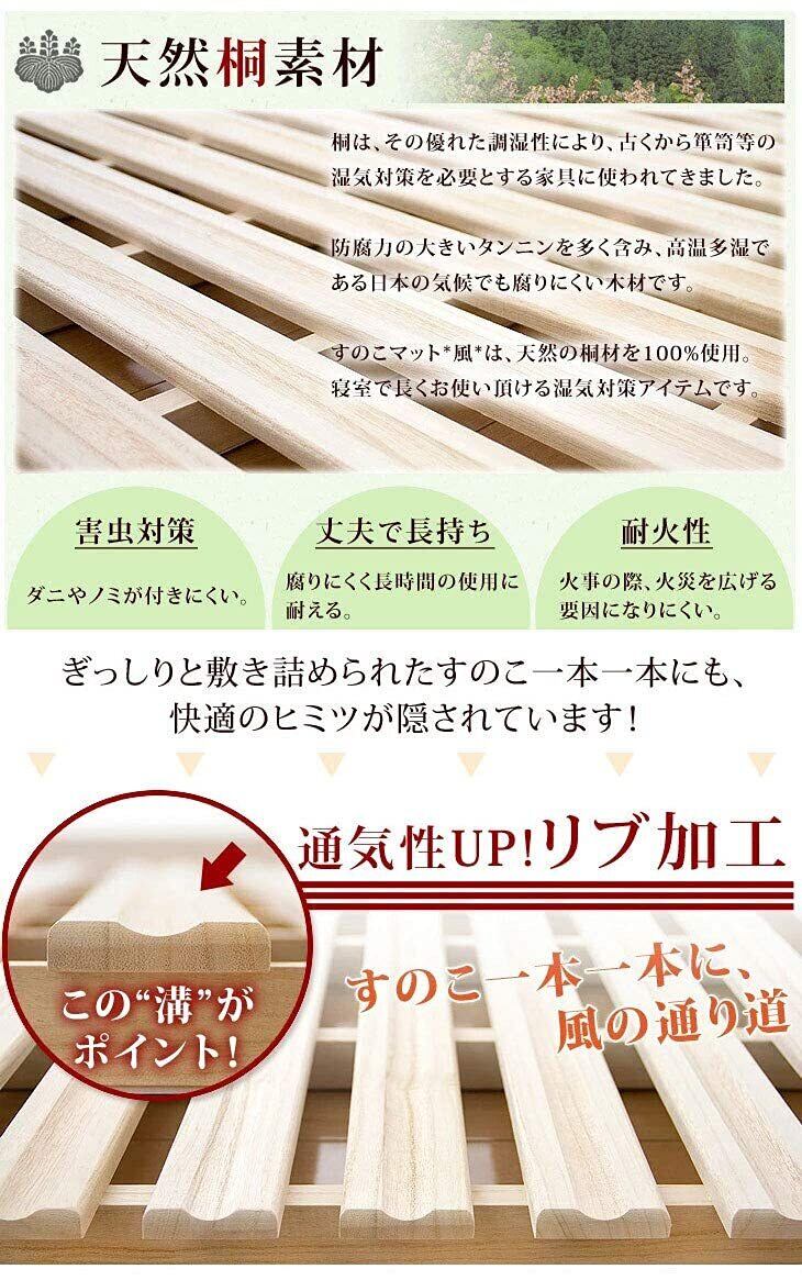 【商品説明】夏場のじめじめ、冬の結露。一年中心配なお布団の湿気対策に、通気性抜群の桐すのこ*風*が登場!平らな桐すのこに更に凹凸をつけたリブ加工で通気性がUP!すのこ枚数も28枚と多くし、寝心地にもこだわりました。二つ折りタイプなので、室内でお布団を干すこともできます。