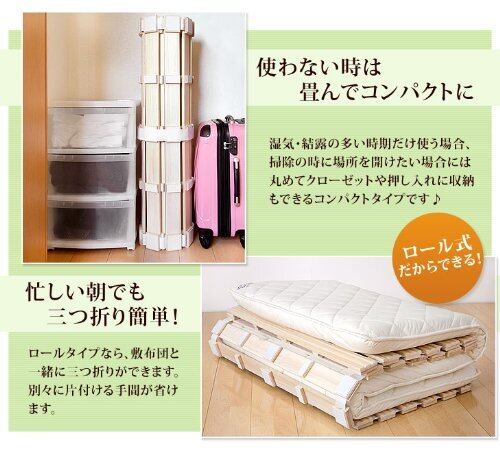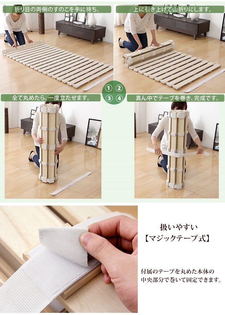 【特徴】・すのこ板に凹凸を付けた通気性抜群のリブ加工 /・耐久性のあるすのこ厚1.2cm /・布団を敷いたまま三つ折れに!片付け楽々 /・折りたたみ固定は簡単マジックテープ式 /・滑り止め付き