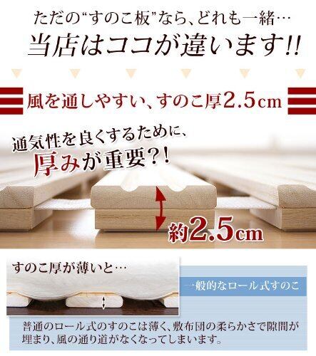 備考:【中国製】※すのこの上に立つ場合はさん木の上に足をかけるなど強度の弱い部分に体重がかからないようにご注意ください。 ※飛び跳ねたり、一点に荷重をかけたりすると割れる恐れがあります。 ※固綿入りの厚手の敷布団や、マットレスでの使用を奨励しています。 ※1カ所に力が加わるようなご使用で破損した場合、取扱い説明書の注意をお守り頂いていない場合などは、返品・交換の対象外となりますので、予めご了承ください。