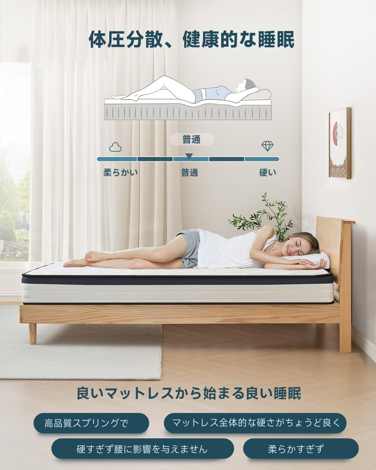 「️3. 体圧分散とサポート力」体圧分散に優れており、快適な寝姿勢をサポートします。Z-HOMポケットコイルマットレスは、体のラインに沿って沈み込み、体圧を均等に分散します。これにより、腰や肩への負担を軽減し、快適な睡眠を提供します。また、高反発ウレタンを使用しており、しっかりとしたサポート力を持っています。