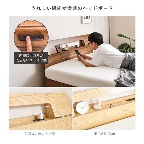 【便利なヘッドボードで快適な就寝前の時間を】スマホやメガネ、時計などの小物をスッキリと収納できるスペースを確保し、2口コンセントを備えたヘッドボードで、照明やスマホの充電が可能です。無駄のない設計で、くつろぎの時間をサポートします。
