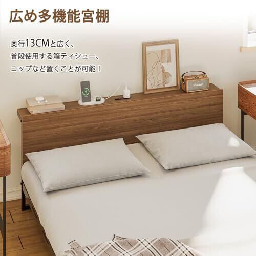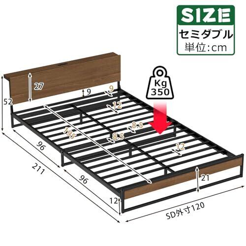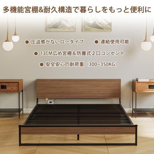 SINNONAKA 2口コンセント宮棚付き ローベッド ベッドフレーム セミダブル ロボット掃除機OK 静音パイプベッド スチール 連結 フレームのみ(ウォールナット×ブラック)