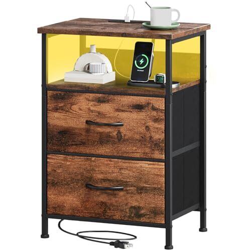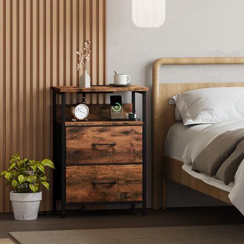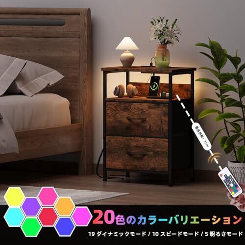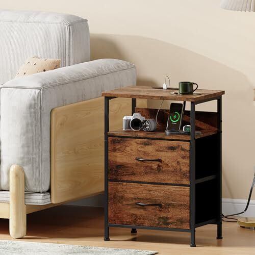 Somdot ベッドサイドテーブル サイドテーブル ナイトテーブル チェスト タンス 収納 おしゃれ USBポート&コンセント付き 棚付き 引き出し 幅42 奥行30 高61 布製 リビング ソファー 一人暮らし 2段 ビンテージ