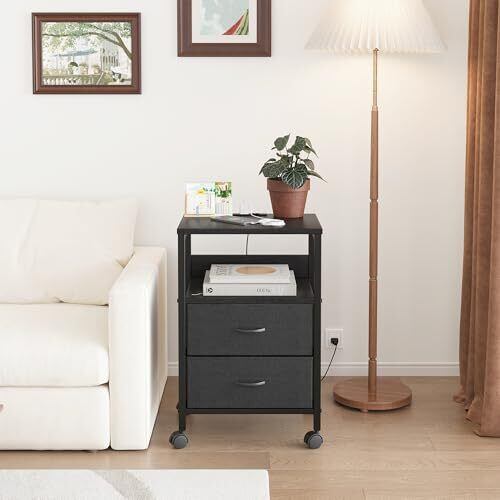 Fly-CTsoar サイドテーブル キャスター付き ナイトテーブル 2つ引き出し付きのベッドサイド テーブル コンセント付き 可移動ナイトテーブル ベッド横 テーブル 北欧 洋服 タンス 天板付き (ブラック, 幅40×奥行30×高さ63cm)