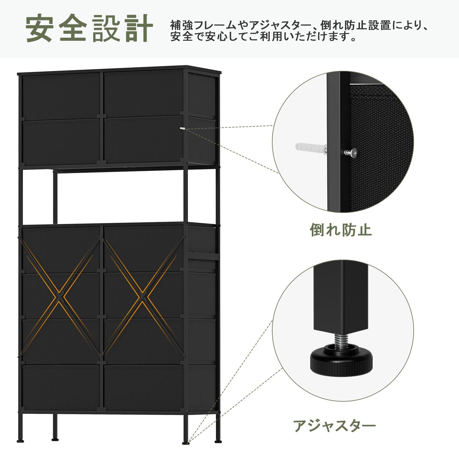「優れた耐久性と安全性」引き出しは三層構造になっており、重いアイテムや頻繁に開閉する際にも安定感があります。さらに、補強フレームとアジャスターを採用することで、全体の丈夫さが向上し、長期間にわたって安心して使用できる設計が実現されています。