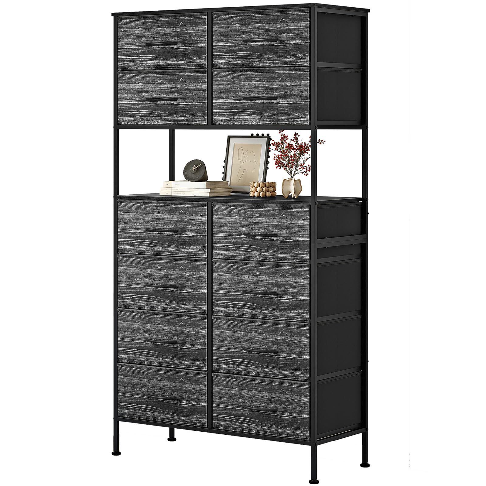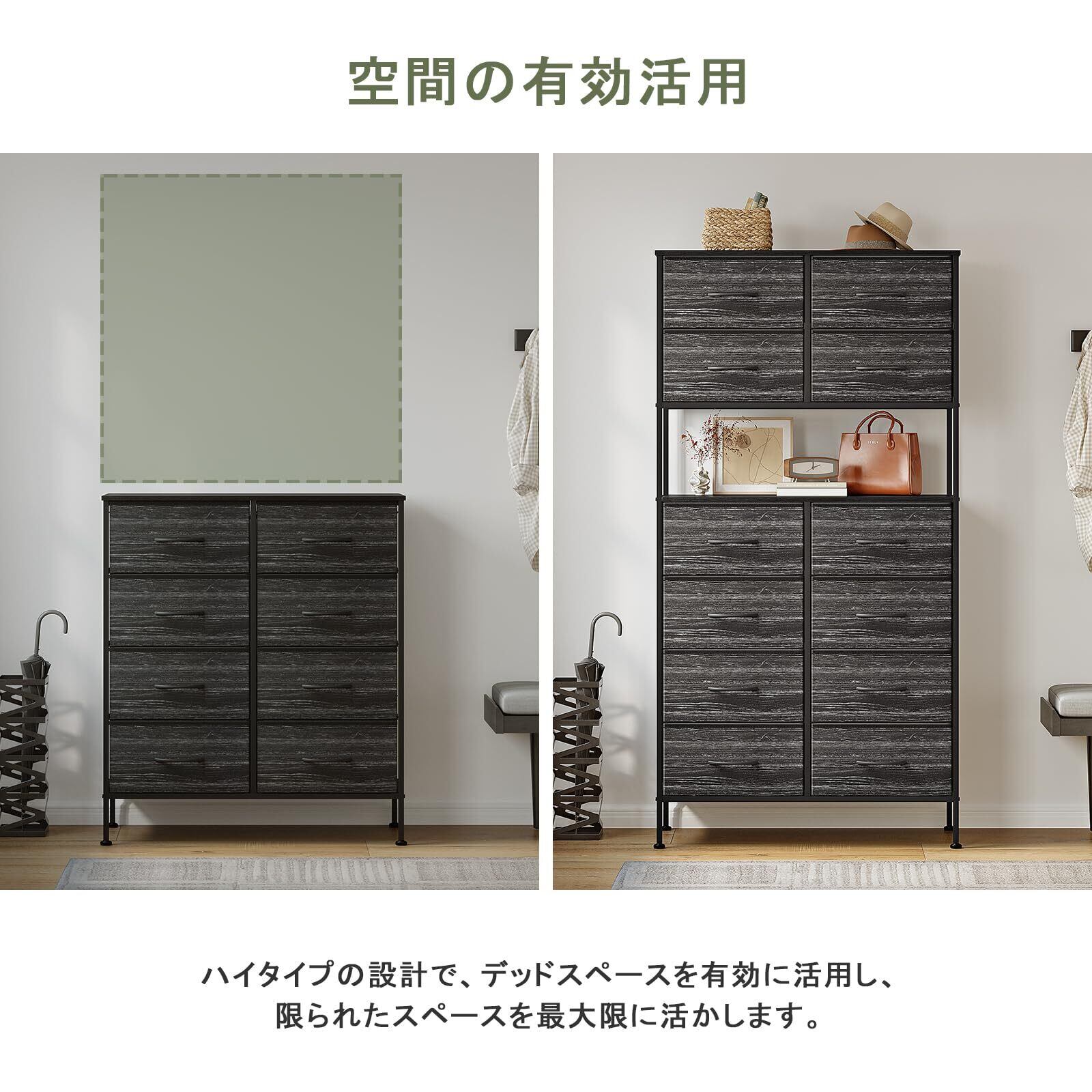 SINNONAKA 12杯 チェスト 大容量 タンス ハイチェスト 中央オープン設計 箪笥 衣装ケース 収納チェスト 省スペース インテリア リビング収納 ハイタイプ 引き出し 洋服タンス 布製衣類収納 シンプル(ウッドグレインブラック)