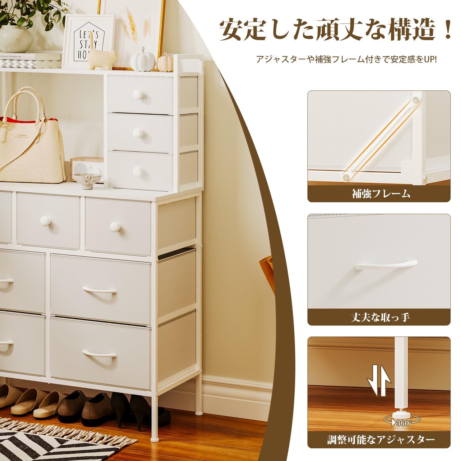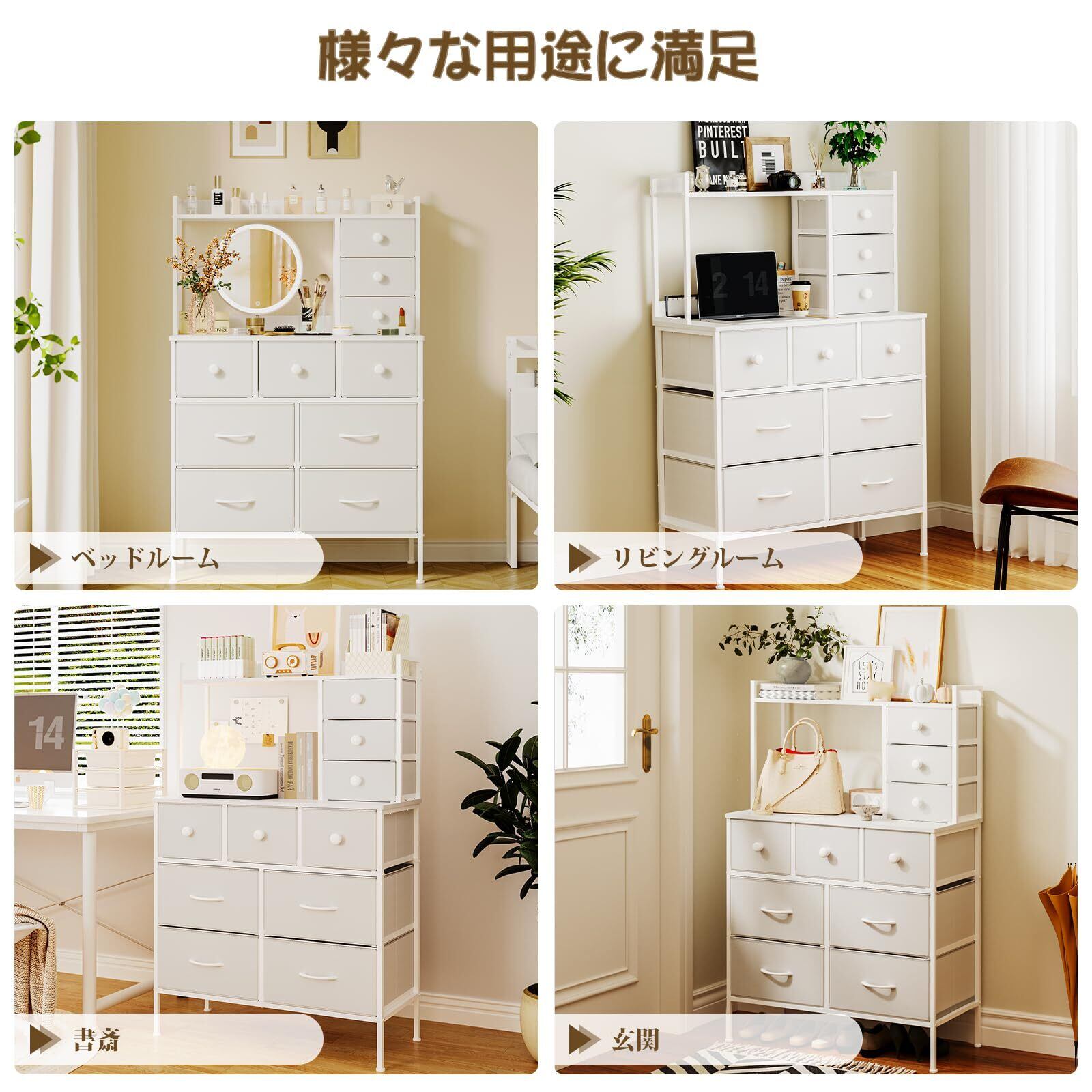 【幅広く収納可能!】三種類のサイズと合計10杯の引き出しを備えており、大型の引き出しは衣類や寝具を収納するのに最適であり、中型と小型の引き出しは小物類や化粧品、シートマスクなどの細かいアイテムの整理にも大活躍!整理整頓が簡単になると同時に、お部屋のスペースを有効活用します。