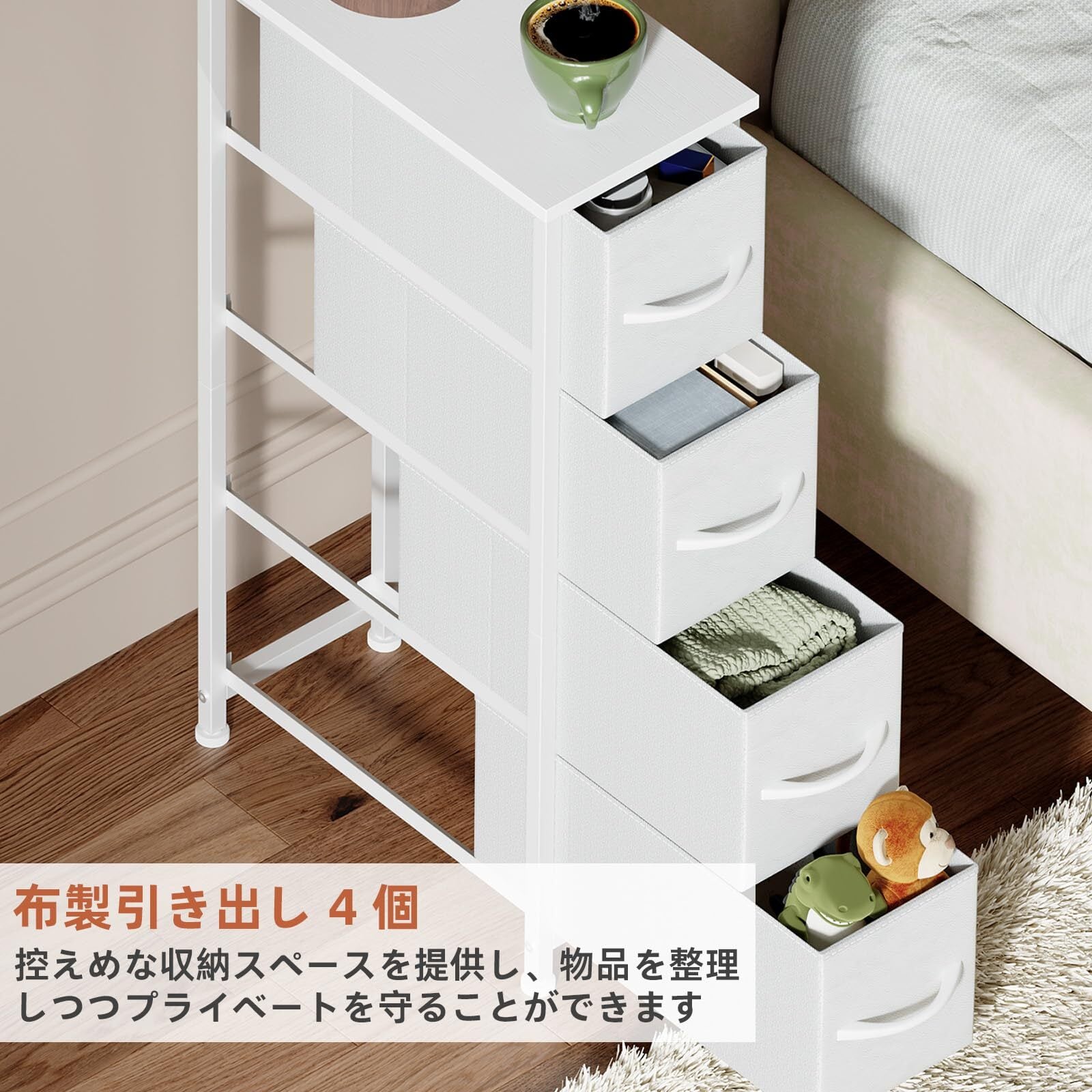 【高品質素材】頑丈で上質なスチール素材のフレームは、安定性と耐久性に優れています。引き出しは通気性・耐久性に優れた不織布で作られており、耐荷重も抜群です。取っ手が付いた引き出しは、取り出しも簡単で大変便利。 天板があるため、本や雑貨を飾ることができ、より使い勝手が向上します。天板の耐荷重は10kgです。