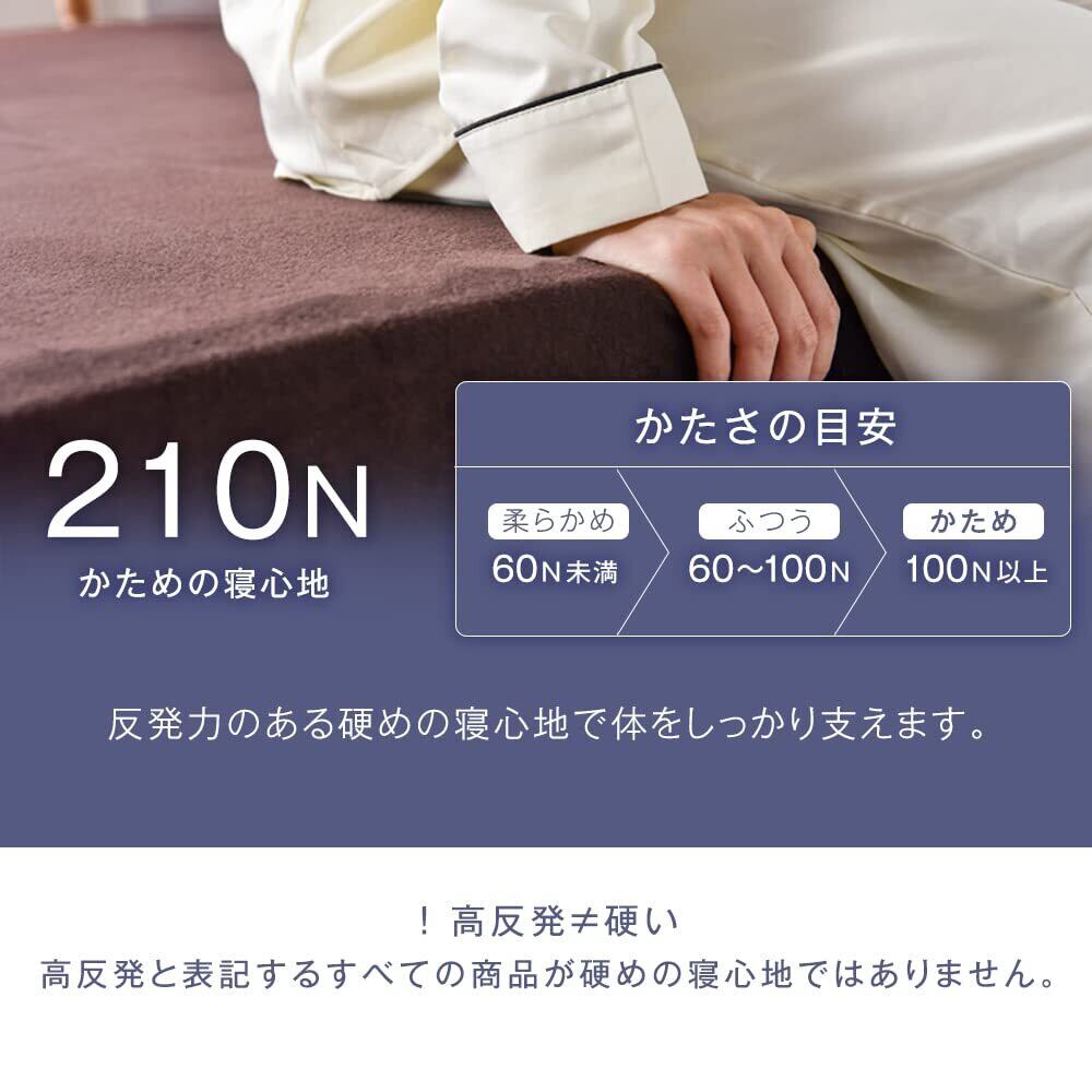 【備考】※圧縮梱包のマットレスについて、ウレタンフォームの感温性(反発弾性フォームは温度が高くなると柔らかくなり、低くなると硬さが高くなる性質)により冬場、寒いところで復元させると、復元に時間がかかります。又、部分的に復元するタイミングが異なる場合がございます。室温が18度以上の部屋に半日くらいおくと、回復がしやすくなります。 ※開封時の臭いは新品のウレタン特有のもので無害です。 ※2017年11月28日より品質表示法の改正に伴い、ニュートン数を180Nから210Nへ変更しました。表示の数値が変わるだけで製品自体の品質・性能に変更はありません。