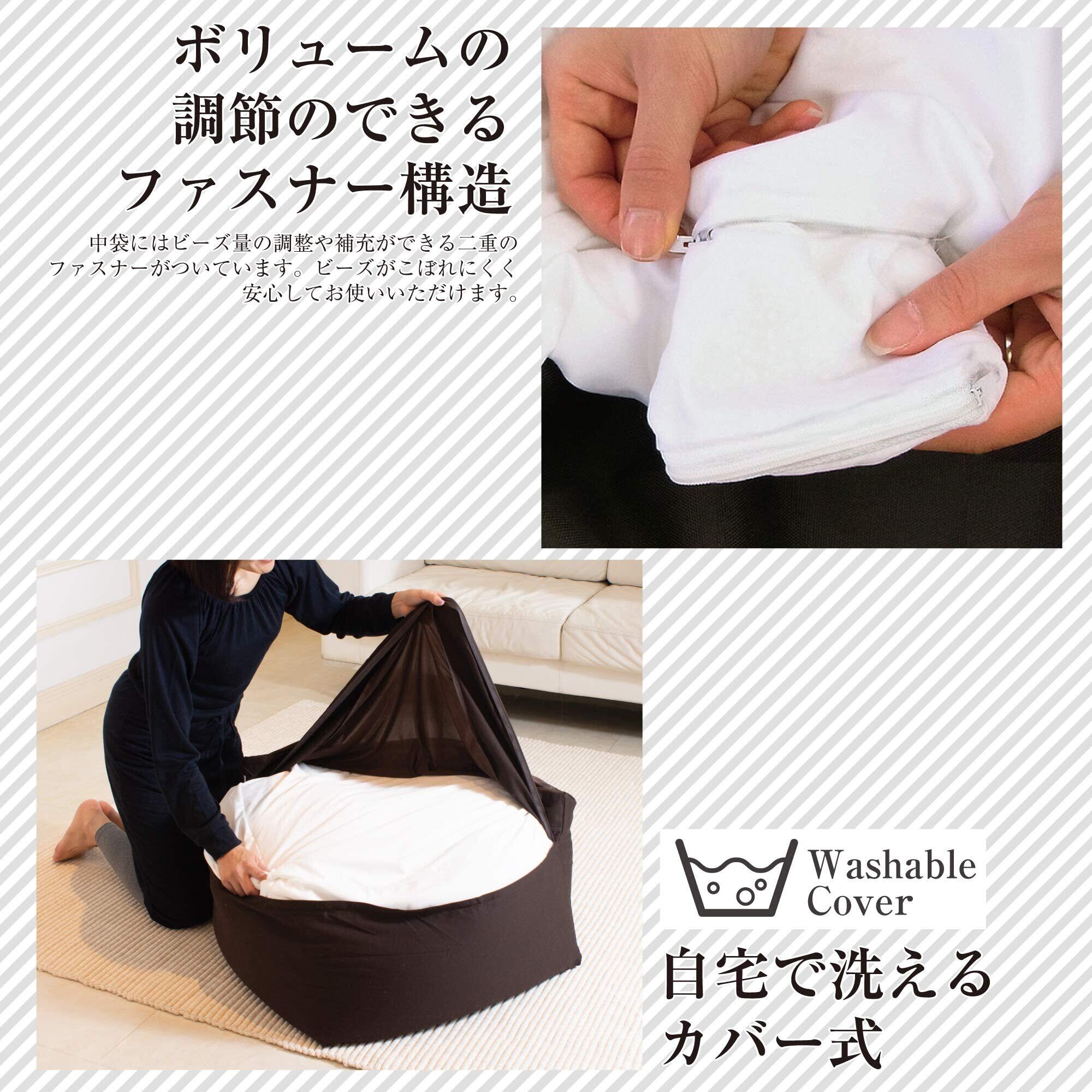 組成 外カバー・伸びる生地:ポリエステル85% ポリウレタン15% 伸びない生地:綿100% 中材:側生地 ポリエステル95% ポリウレタン5% / 詰め物 発泡ポリスチレンビーズ(直径約0.5mm)