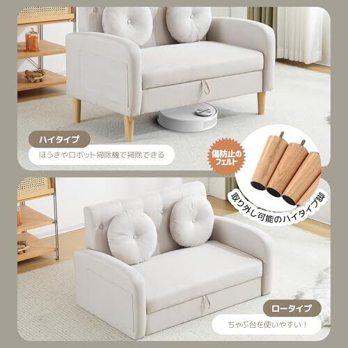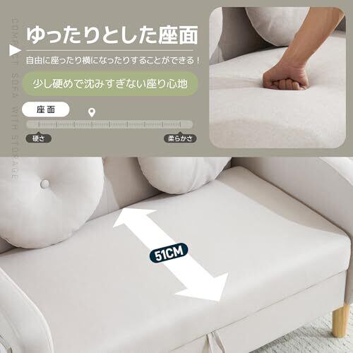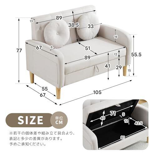 商品仕様 素材:クッション材:ウレタンフォーム、ウェービングベルト、シリコンフィル 張り材:ポリエステル 構造部材:木材 脚:ブナ カラー:ダークブルー、ライトグレー、ベージュ サイズ:二人掛けソファー:120*71*82cm(肘掛け、木脚を含み) 重量(N*W):26.75KGS 重量(G*W):24 KGS サイズ:105*75*62cm 組立品/完成品:組立品(背もたれ、脚のみ) おすすめのポイント: 1. たくさん収納できるソファー 2. 背部までスッキリとした外観。 3. 取り外し可能の木脚付き、脚なしで利用可能 4.座席は弾力性、座り心地に優れた高品質のスポンジを採用 5.コンパクトで狭い部屋にピッタリ 6.着脱が簡単な背もたれ たくさん収納収納スペース付き ソファーに収納スペースついています。布団、オモチャなどの生活用品を簡単に収納できます。ワンルームのような狭い部屋の収納空間は大幅に上昇します。 ブナ無垢材の木脚付き、脚なしで利用可能 取り外し可能なブナ材製の木脚付き、女子一人でも簡単に組み立てられます。脚なしでも利用可能なので、ご都合によりご利用いただけます。 座り心はよい座席 座席は高品質のスポンジを採用され、弾力性、座り心に優れています。ちょうどいい硬めで安定性もあります。長く座ってもお体の負担になりません。座席の張地は100%ポリエステルなので柔らかくて肌に優しいです。毛玉もなりにきぃです。 高さ15㎝の木脚付き 木脚の長さは15㎝なのでほとんどのロボット掃除機は対応できます。ソファー座面下の掃除は楽です。木脚なしで利用の場合には、床から1.5㎝の高さです。 着脱が簡単な背もたれ 背もたれの着脱は簡単なソファです。 差し込み式のなで、背もたれを座席の後ろにある取り付け穴に差し込むだけ設置OKです。 引越しなどの状況に合わせ、引き抜いて段ボールに入れるの運搬にも便利。 コンパクトで狭い部屋にピッタリ 幅約120cm、場所を取らないのでひとり暮らしの方やワンルームにすすめます。 ご注意: ※お客様組み立て品となります。 ※本商品の組み立てやご使用に際しては、乱暴に扱いますと破损やケガの原因となりますので、丁寧にお取り扱いください。 ※商品デザインは、品质に差し支えない程度に、予告なく変更する場合があります。 ※新しく入荷した商品は今まで贩売していた商品と色差がある場合がございます。 ※商品のデザインが写真と違う場合がございますが品質上の問題なく使えますのでご了承下さい。 ※必ず水平で、安定した場所に設置してください。