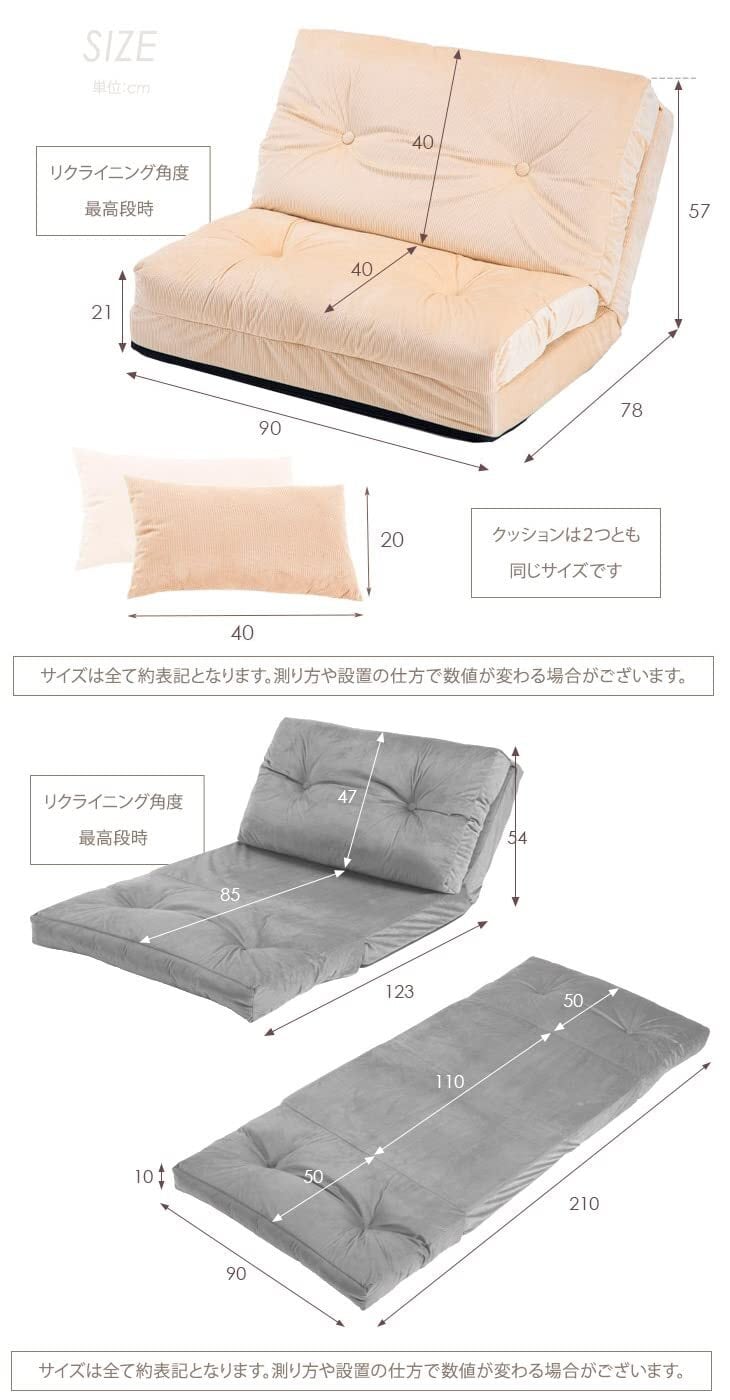 【サイズ】[ソファ時]幅90×奥行72×高さ54cm / 座面の高さ24cm [ベッド時] 幅90×奥行210×厚さ10cm [クッション] 幅40×奥行20×厚さ12cm【重量】約12kg