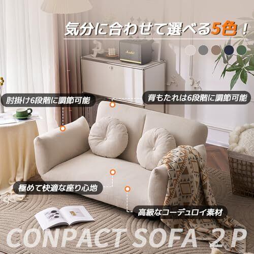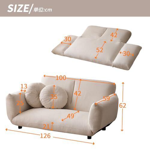 *「背面」6段階ギア リラックスする時の姿勢は人それぞれ。 このソファの背もたれは調節ができる6段階のリクライニングギアが付いているので、自分の好みの角度に細かく調節することができます。 *「肘掛け」6段階ギア 左右の肘掛は6段階のリクライニングが可能です。両側をフラットにしてベッドにしたり、片方だけを倒してちょっと休む際の枕にしたりと、気分に合わせた使い方ができます。 *解放感をもたらすロータイプ ソファの座高高は21cmと空間を広く見せてくれるロータイプになっています。 解放感をプラスしつつも、しっかりと座ることができる賢い設計はワンルームなどのお部屋にもおすすめです。 クッション折りたたみの状態では座椅子として。 ローテーブルと合わせてゆったりコーヒータイムなどに。 *カウチスタイル 座面を広げると座面に奥行きが出てロングサイズに。 足を伸ばしてゆったりくつろぎたい時に最適なカウチスタイル。 *フラットスタイル 背もたれのクッション部を広げ、背もたれを倒せばフラットスタイルに。 お昼寝やごろんとくつろぎたい時におすすめ。 *自在なリクライニング 背もたれは6段階リクライニング可能。 読書、お昼寝、来客時など、多彩なシチュエーションそれぞれに合った形に調節できる。 自分だけのお好みの角度調節で、オリジナルのくつろぎスペースを作れる。 *身体をやさしく包む肉厚クッション 座面と背もたれのクッション部分には、ウレタンフォームを採用。ふっくらとした仕上がりで底付き感がなく、体を優しく包み込むような座り心地。 またウレタンはわたのクッションに比べてへたりにくく、心地よさが長持ち。 *コンパクト梱包&簡易組立 梱包がコンパクトになり、玄関からの搬入がしやすい。 *二つクッション付き 付属の同色クッションは、腰に当てるのにちょうど良い、細長い形です。 枕にも使えますのでリラックスタイムにご利用ください。 *コンパクト収納 普段しまっておきたい人に嬉しいコンパクト収納。 お掃除の時やカビ対策に陰干ししたい時に立てておくこともできます。 *座面の厚みは約21cm。 たっぷりのクッション材が入っているので、ふわふわの座りごこちです。 *こだわりの三層構造 ボリュームのあるチップウレタン、ピュアウレタン、肌に近い上層のシリコンフィルの三層構造で底付き感のない快適な座り心地を実現しました。さらに、一番下にSバネを入れることで、しっかりと座面を支える構造になっています。 *セーフティーサポートで安定感UP 背もたれを倒して使う際、背もたれには大きな圧力がかかります。これを支えるため、背もたれにしっかりとしたセーフティーサポートを付けました。セーフティーサポートが圧力を受け止めることで、ソファがバランスを崩して傾くのを防止します。