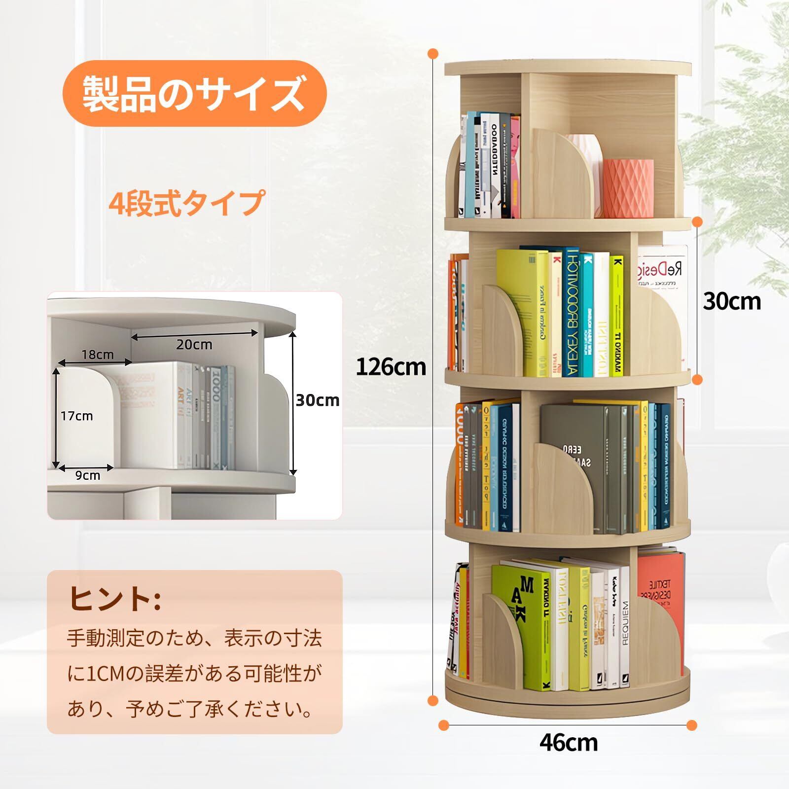 回転式本棚で簡単に整理:この回転本棚は360度自由に回転でき、どの角度からでも簡単にアクセスできます。軽く回すだけで、必要な本をすぐに見つけることができ、混乱を防ぎます。360°回転式本棚は本や展示物を美しくディスプレイするための理想的なアイテムです。厚みのある木板が高い安定性と耐久性を提供し、各段は木板で仕切られており、本の倒れを防ぎながら分類を簡単にします。