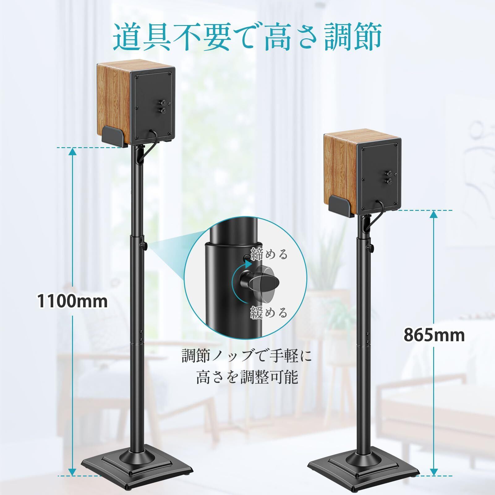 "【高さ調整可能】調節ノブで手軽にスピーカースタンドの高さを865~1100mmまで柔軟に調整できます。家庭、会議室、ラジオなど様々なシーンで大活躍で、臨場感あふれる視聴環境ができます。 "