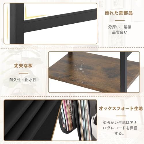 大容量レコード棚:様々なアナログレコードを集めるのがお好きでしたら、最適な収納棚です。テーブルの脇の布袋には、必要に応じてたくさんのレコードを収納したり、レコードの分類をしたりすることで、レコードの整理や取り出しに役立ちます。
