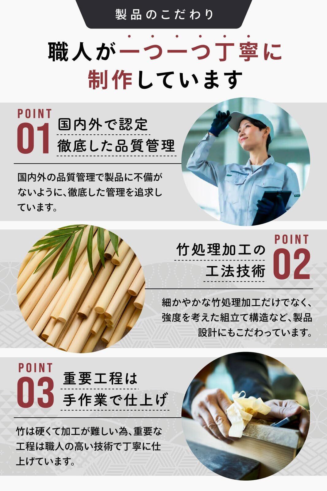 【職人の手仕事が光る ― 素材選びから仕上げまで、丁寧に】認定工場で選び抜かれた高品質の竹材を、熟練の職人がひとつひとつ手作業で仕上げ。 天然素材の温もりと繊細な美しさが、あなたの空間に自然と溶け込みます。