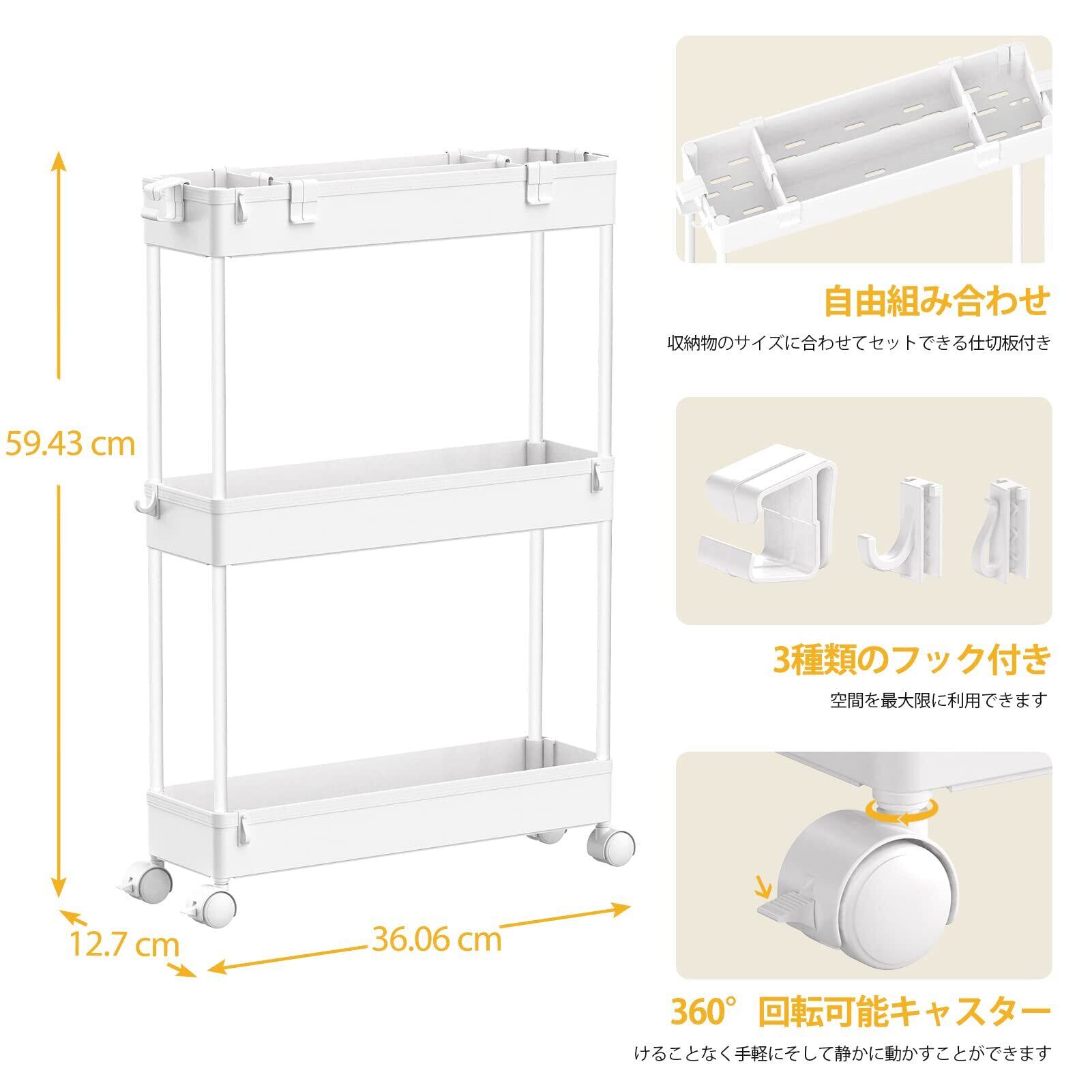 SPACEKEEPER キッチンワゴン 隙間収納 スリム 13cm 収納カップ 仕切板付き 多機能 小物 食品 調味料 キャスター付き 組立簡単 浴室 台所 冷蔵庫横 3段 ホワイト