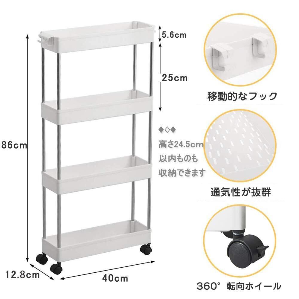 【スリム隙間棚・収納力抜群な収納ラック】 製品サイズ:40cm*12.8cm*86cm。(2サイズがあるので、ご購入前にご注意ください)本製品はコンパクトなデザインながら、収納力に優れており、小型ワゴンとして調味料や掃除道具、バスアメニティ、洗面所など、散らばるアイテムをすっきり収納することができます。スリム隙間ラックですが、1段あたり7〜10本の500mlのペットボトルを収納することができます。様々な場所で使用でき、カラーバリエーションも豊富です。是非お試してみ下さい。