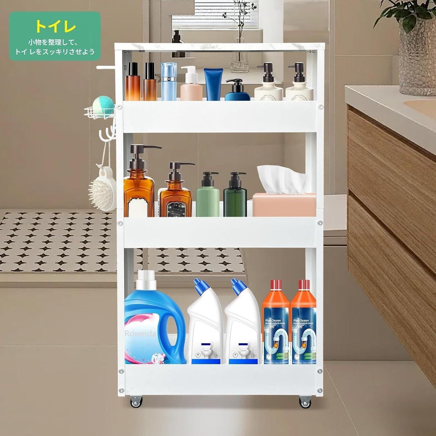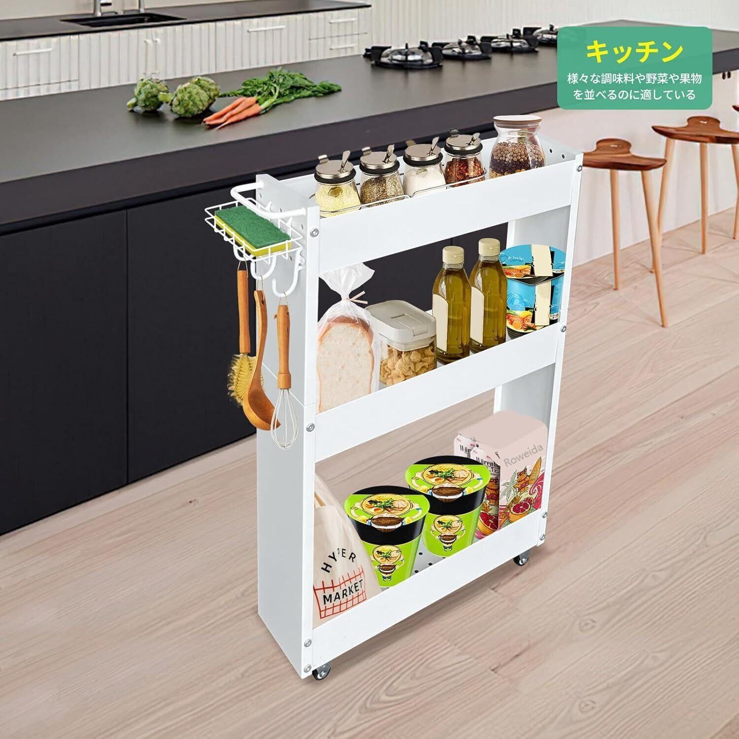 【さまざまな場面に対応】この細長い隙間収納棚はさまざまなシーンに適しており、製品本体には取っ手、4つの車輪、3つのフックがあり、出し入れが便利で、キャビネットと冷蔵庫、洗濯機と乾燥機、机と壁などの間の狭い空間(幅13 cmのみ)に最適です